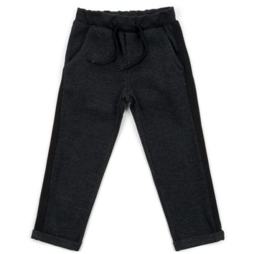 Зручні симпатичні штанці чорного кольору в ледве помітну темно-сіру клітинку, з трикотажними лампасами по боках і ефектними фіксованими підворотами по низу - відмінний вибір для вашого юного модника.
