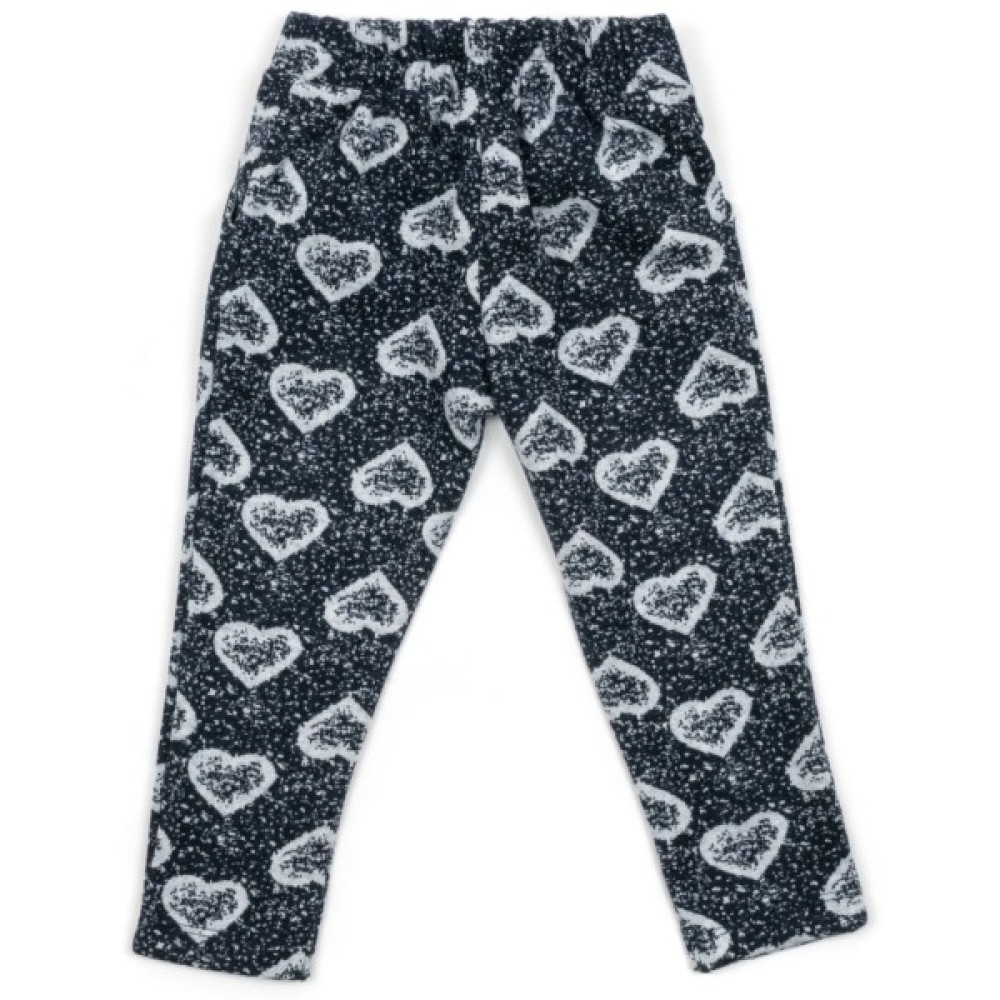 Зручні симпатичні штанці темно-синього кольору в світло-сірі сердечка, з двома передніми прорізними кишенями і модним ефектним бантом.