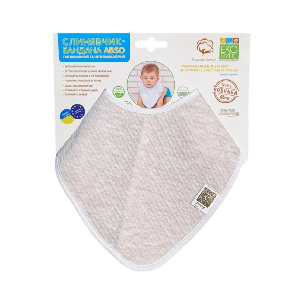 • Натуральний непромокальний і вбиральний слинявчик-бандана Еко Пупс Abso колекції Jersey — це елемент дитячого одягу, стильний і функціональний аксесуар, який призначений для захисту одягу від забруднень під час підвищеного слиновиділення в процесі прорізування молочних зубів дитини.
