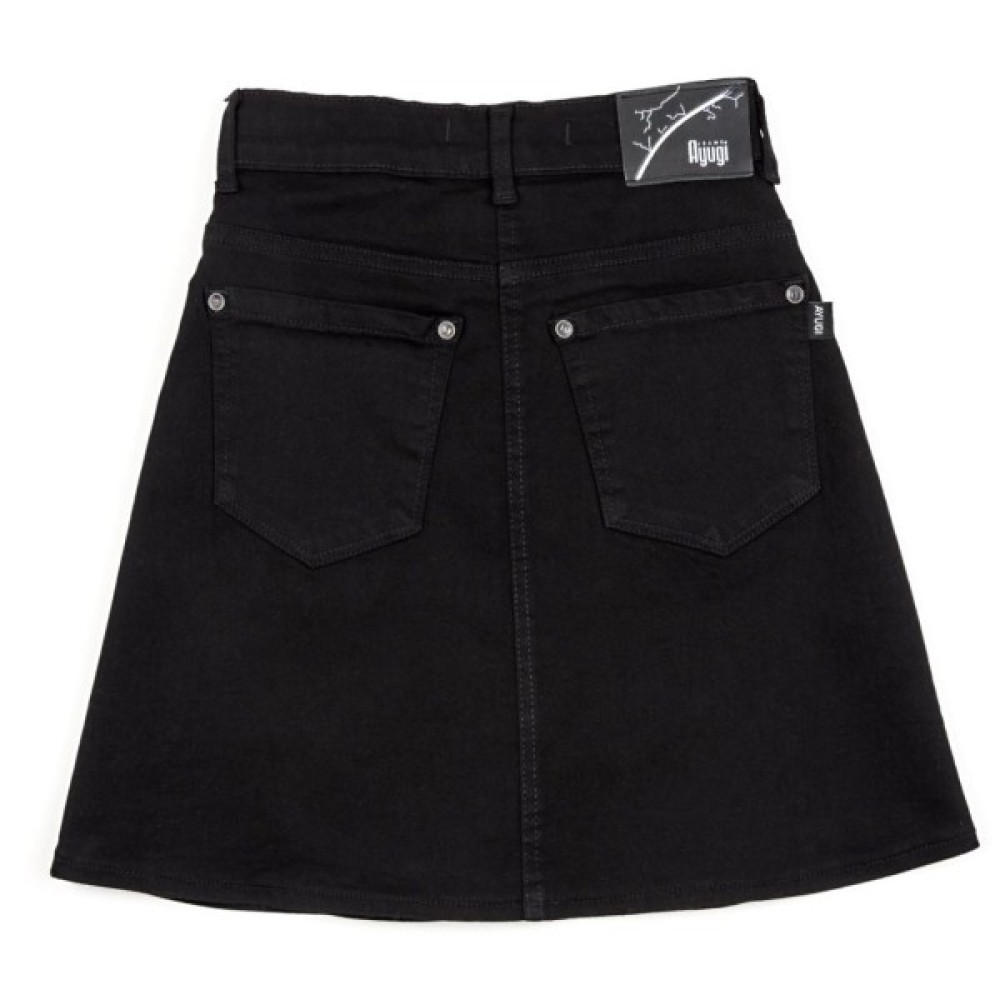 Класична модель «5 кишень», розширеного А - силуету, кишені зафіксовані фірмовими заклепками. Застібається спідниця на гудзик і металеву блискавку. У поясі з внутрішньої сторони вставлена гумка з гудзиками, яка допоможе відрегулювати обсяг талії. Тканина щільна.