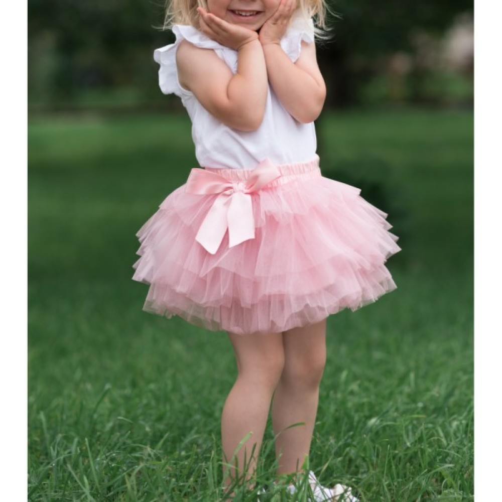 Спідниця складається з основної трикотажної спідниці, з якісного м’якого турецького бавовняного трикотажу, та чотирьох ярусів м’яких шифонових оборок: перший верхній ярус - одинарний, три інших - подвійні (нижня оборка довша за основну спідницю на 6 см). Трикотажний пояс на гумці, з ефектним атласним бантом,забезпечить відмінне почуття комфорту.