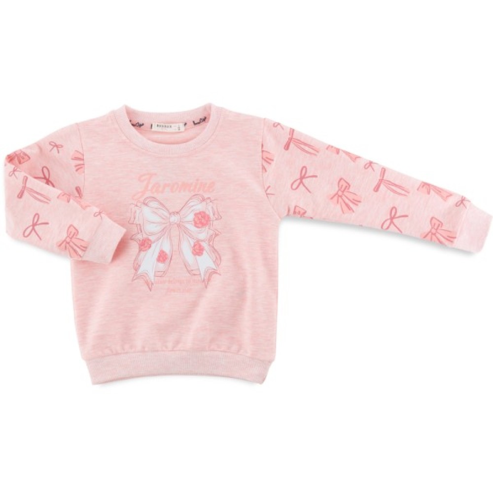 Затишний вільний світшот прямого силуету з довгими рукавами. Перед прикрашений красивим принтовим малюнком великого бантика.