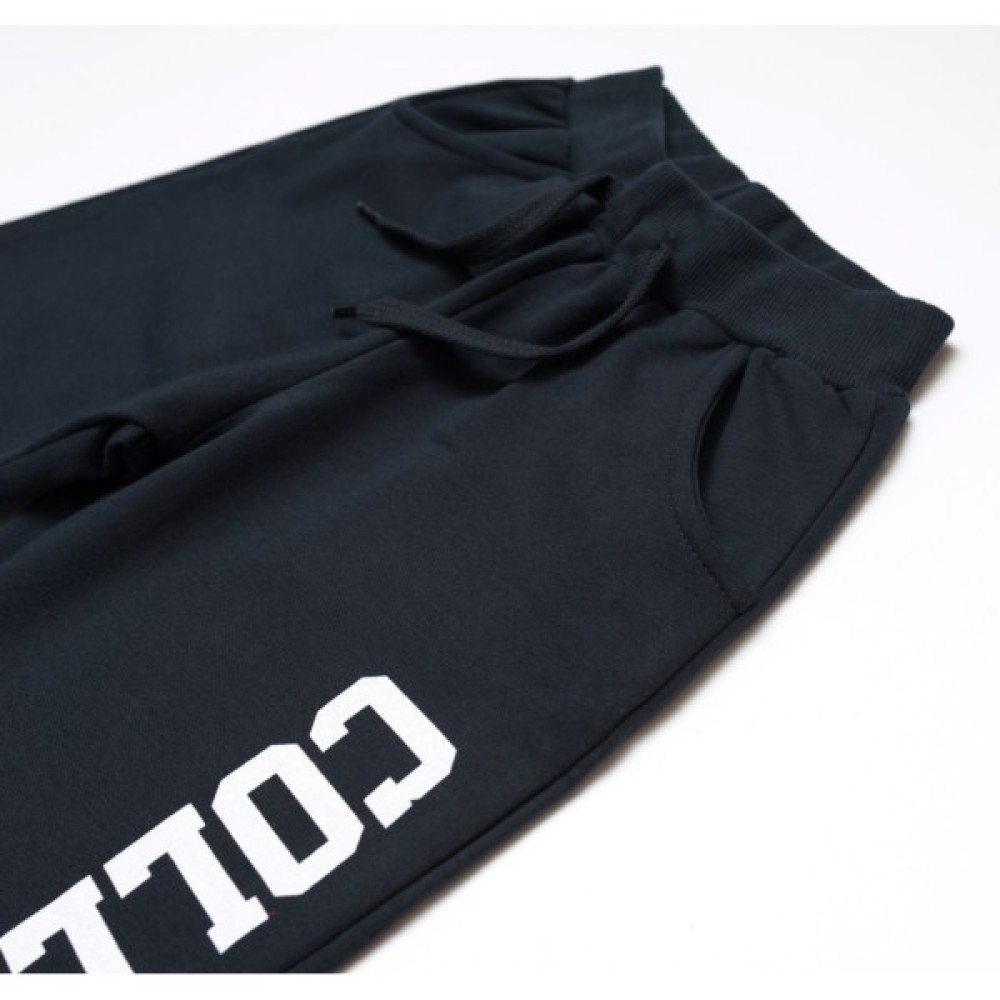 Зручні штани на манжетах, з двома прорізними кишенями, також прикрашені ефектним контрастним принтовим написом і смужками білого кольору. Еластичний пояс і манжети з подвійної трикотажної гумки, забезпечать затишок і оптимальну посадку по фігурі. Пояс додатково посилено широкою вставленою гумкою. Шнурок декоративний.
