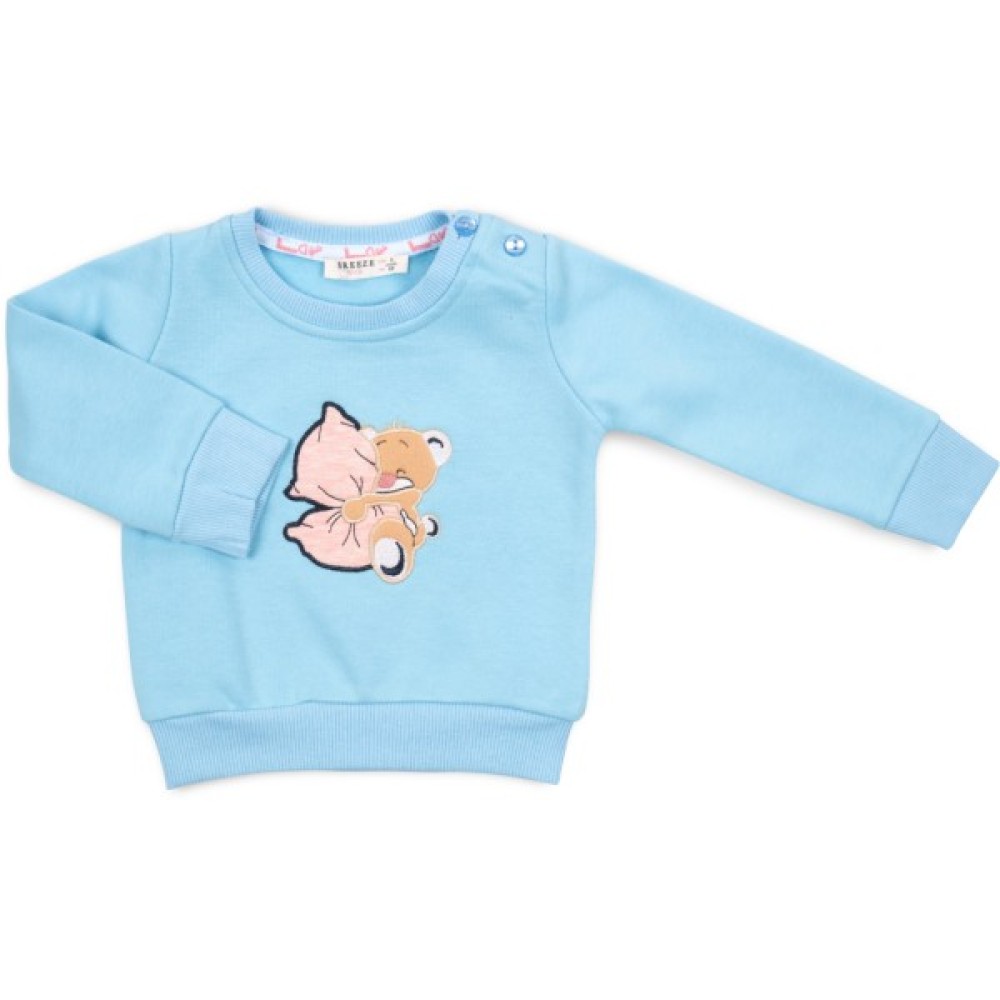 • Затишний світшотик прямого покрою під гумку в поясі, з довгими вшивними рукавами на манжетах, прикрашений спереду на грудях акуратною, кольоровою, дуже милою аплікацією ведмедика в обіймах з подушечкою. Манжети рукавів, лінія низу та горловина оброблені подвійною, якісною трикотажною «гумкою». На лівому плечі виконана застібка на перламутрові фірмові ґудзики.