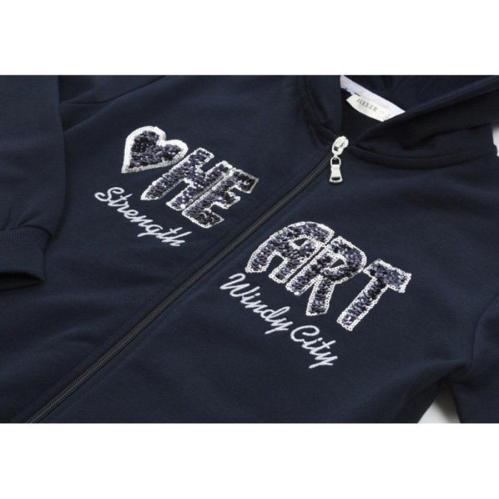 Затишна куртка - «олімпійка» під гумку, з довгими рукавами. Оздоблена шикарним, яскравимю об'ємним написом «HEART» з блискучих синіх і сріблястих паєток з акуратною вишивкою, та на спинці написом і об'ємним серцем з таких самих паєток. Манжети рукавів і лінія низу оброблені подвійною якісною трикотажною «гумкою».