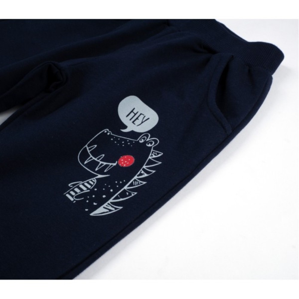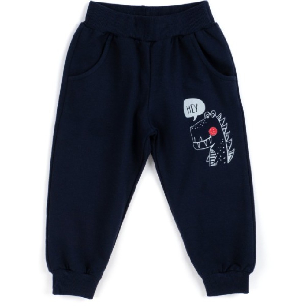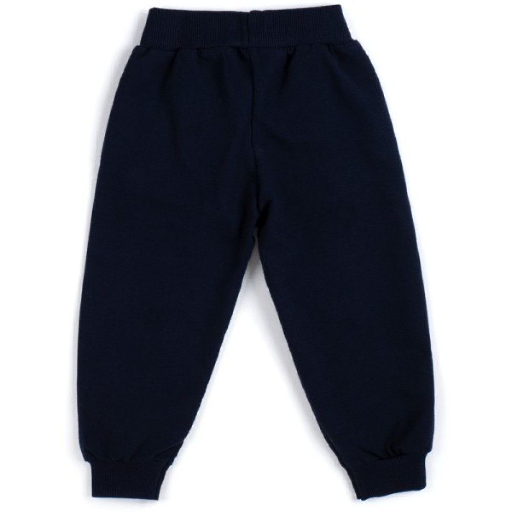 • Штани темно-синього кольору, на манжетах, із двома передніми прорізними кишенями, без застібок. Еластичний широкий пояс і манжети - рібана (в подвійну трикотажну «гумку»), що забезпечує комфорт і оптимальну посадку по фігурі. Пояс додатково посилений широкою вставленою «гумкою». Штани прикрашені аналогічним кольоровим принтовим малюнком.