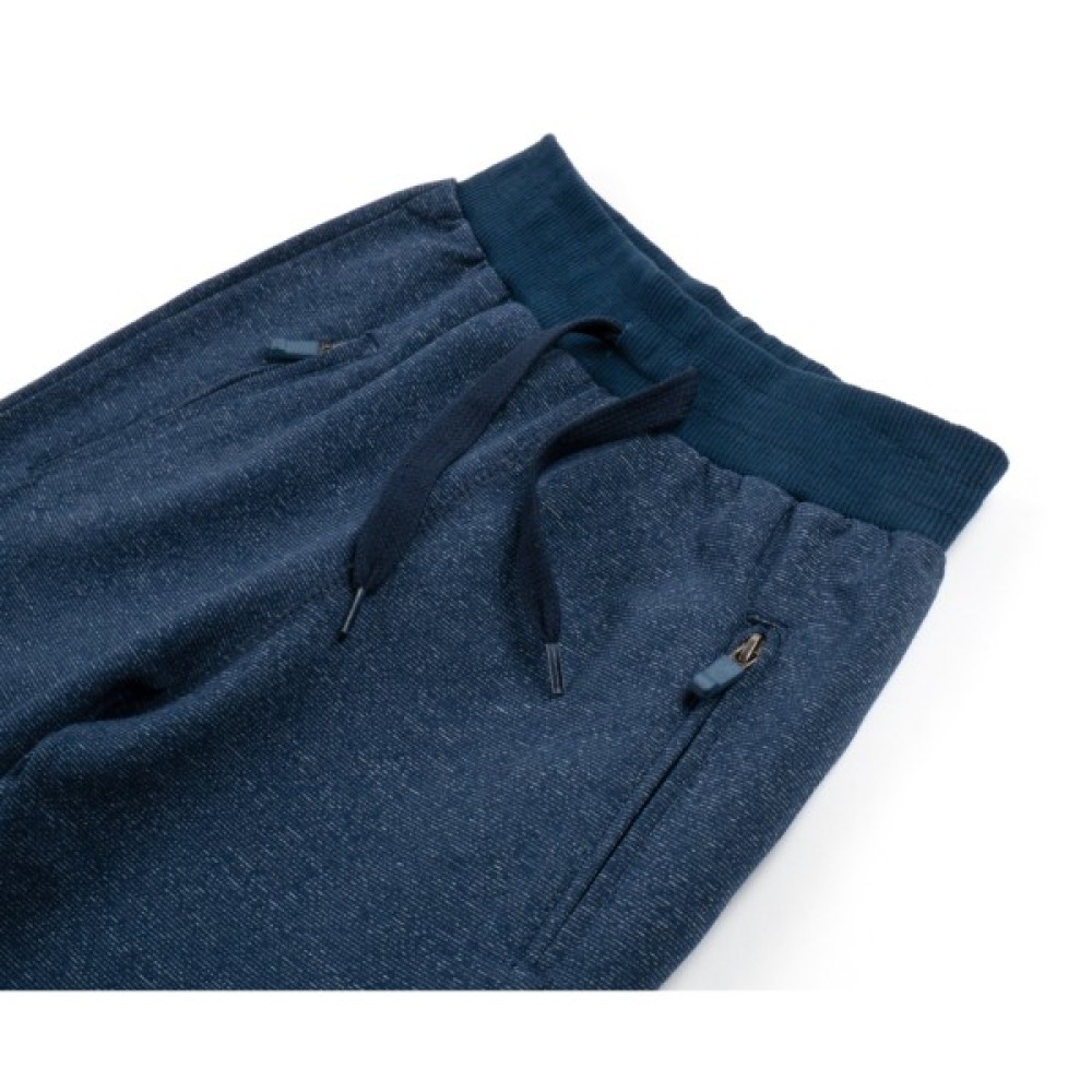 Зручні вільні штани, темно-синього меланжевого кольору, з двома глибокими прорізними кишенями, які застібаються на «блискавку», м'яким поясом та манжетами внизу штанів.
