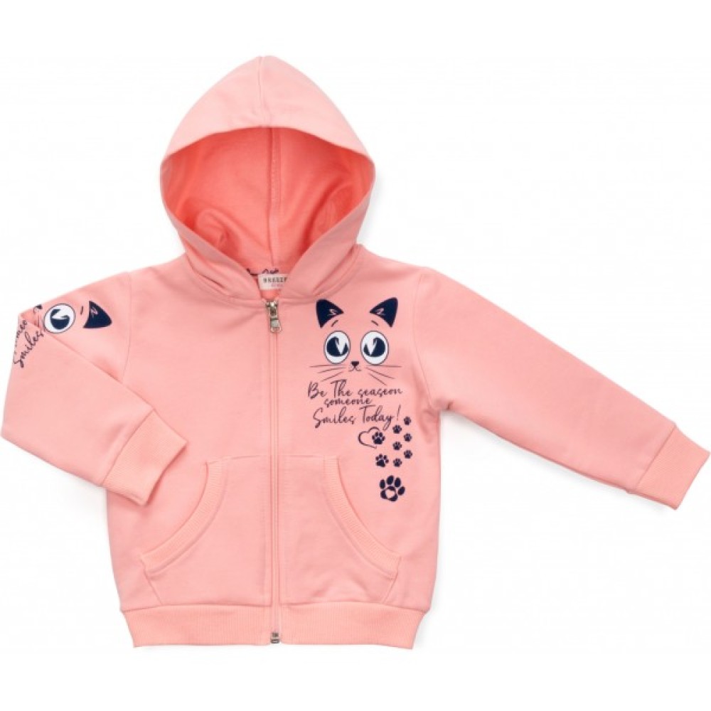 Олімпійка приємного персикового кольору, прямого силуету, з капюшоном (капюшон без підкладки), з довгими рукавами на манжетах. Манжети рукавів та низ кофти із щільної, якісної, подвійної трикотажної «гумки». Блискавка якісна, капронова, середній "трактор", з металевим бігунком та легким ходом.