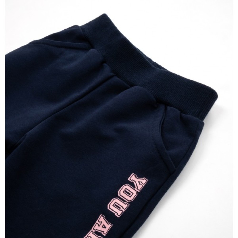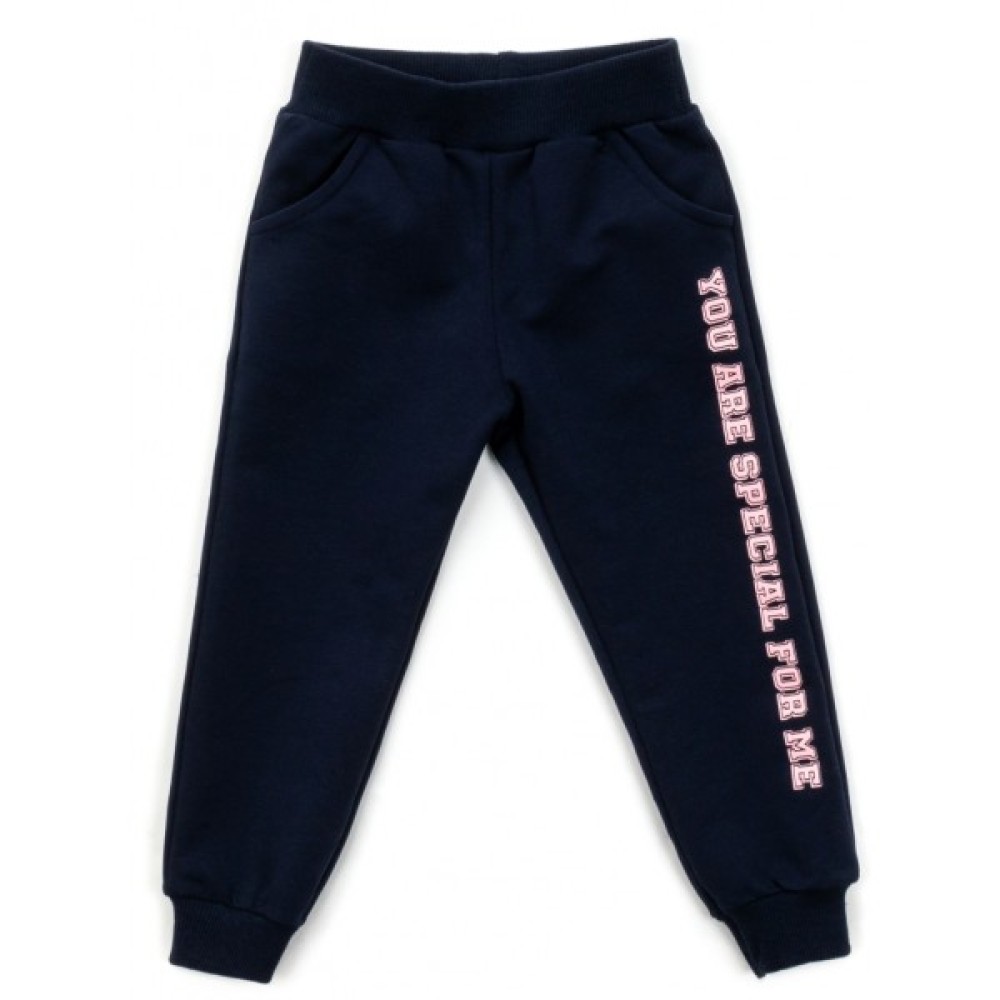 Зручні спортивні штани темно-синього кольору, внизу на манжетах, під гумку в поясі та з двома прорізними кишенями, забезпечать комфорт та оптимальну посадку по фігурі.