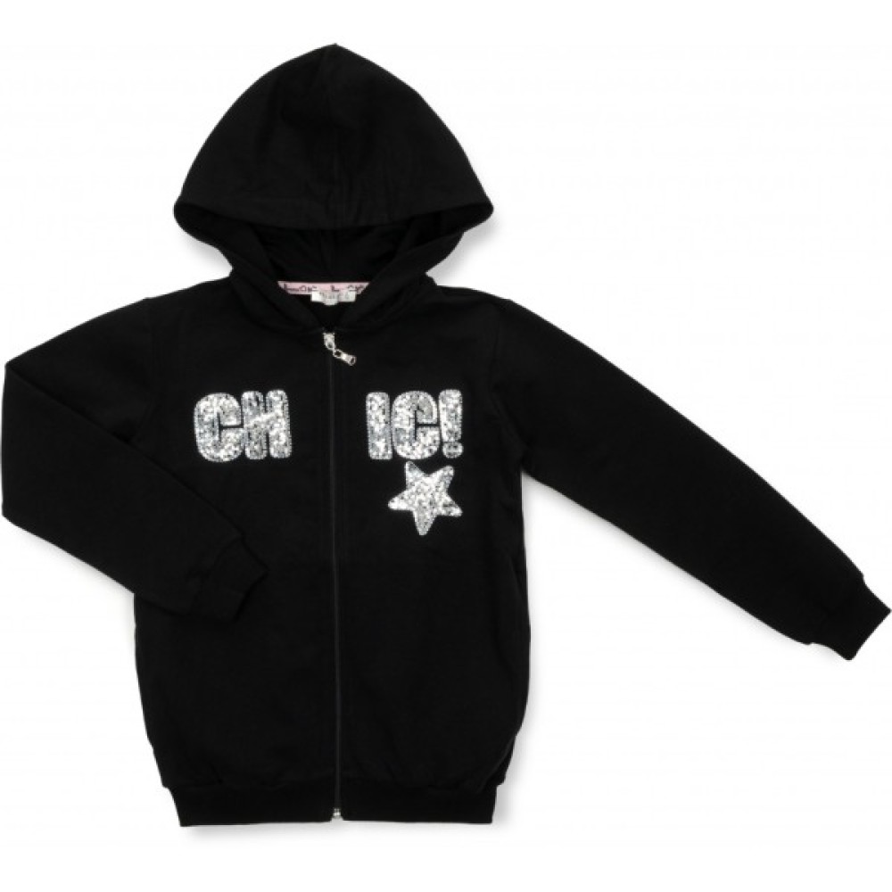 Капюшон подвійний, всередині на підкладці. Куртка попереду прикрашена словом «CHIC» в техніці пришивних паєток срібного кольору (паєтки не перевертаються). На спині куртка також розшита золотими, срібними та чорними паєтками. Манжети рукавів і низ кофти оформлені якісною трикотажною «гумкою». Блискавка якісна, капронова, з металевим бегунком. На «олімпійці» в бічних швах виконані вертикальні неглибокі кишені без застібки.