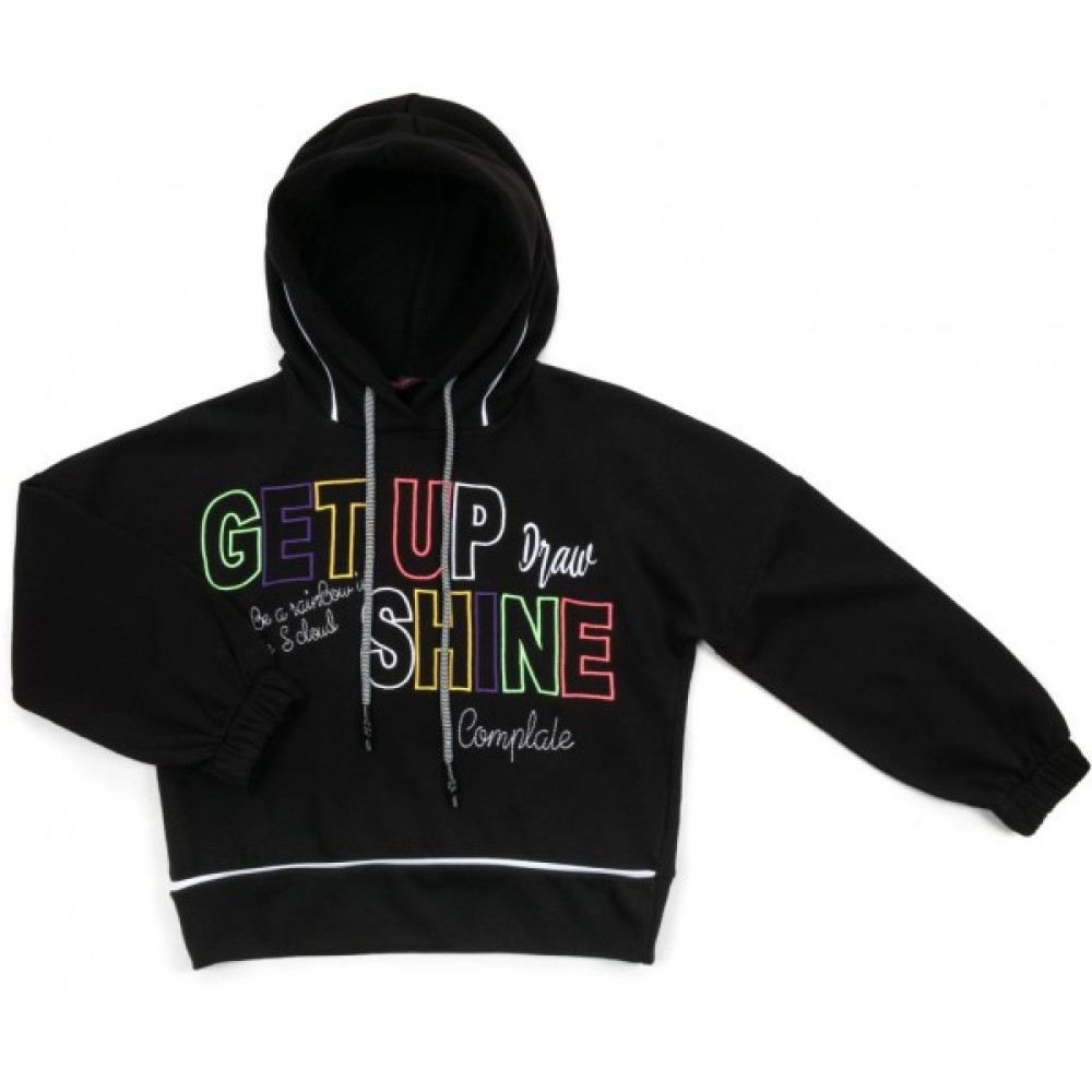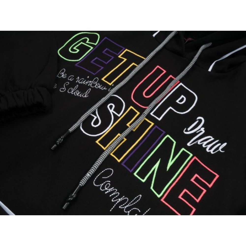 Затишний худі прямого силуету, ефектного вільного крою, з вшитим капюшоном і подовженою лінією плеча, красиво прикрашений барвистими написами з акуратно вишитих різнокольорових літер (кольори дуже яскраві і соковиті). Довгі рукава знизу зібрані на широку гумку.