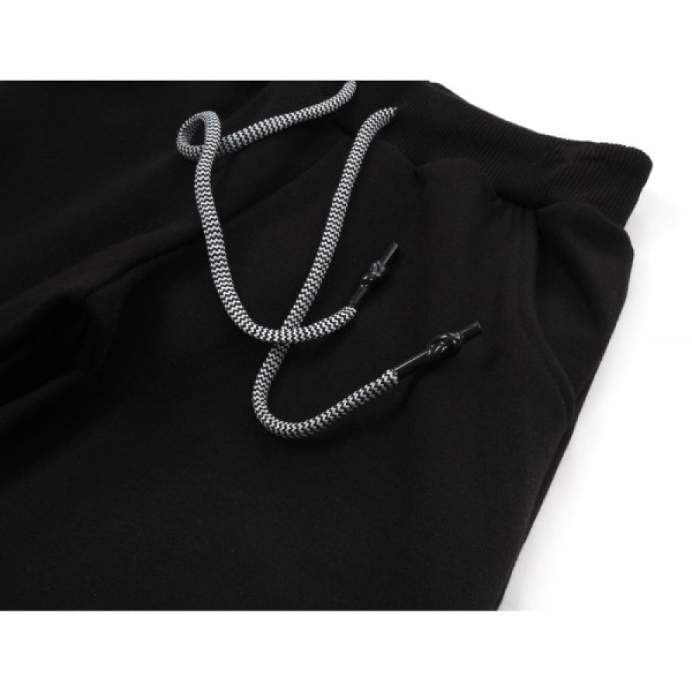 Зручні вільні спортивні штани під гумку в поясі і по низу штанин, з двома прорізними кишенями, так само прикрашені яскравою вишивкою. Еластичний широкий пояс, з подвійної трикотажної «гумки», посилений вставленою широкою гумкою, яка дорівнює ширині пояса. Низ штанин підвернутий, призібраний і застрочений разом зі щільною широкою гумкою. У капюшон і пояс штанів вставлені функціонуючі круглі шнурки з ефектними пластиковими наконечниками.