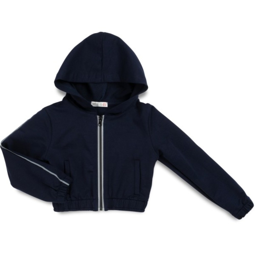 • Модний, стильний костюм для дівчинки, темно-синього кольору: укорочена курточка з капюшоном та штани на манжетах.