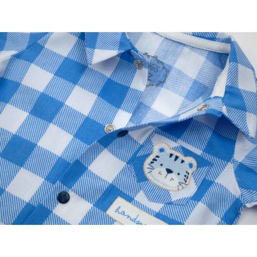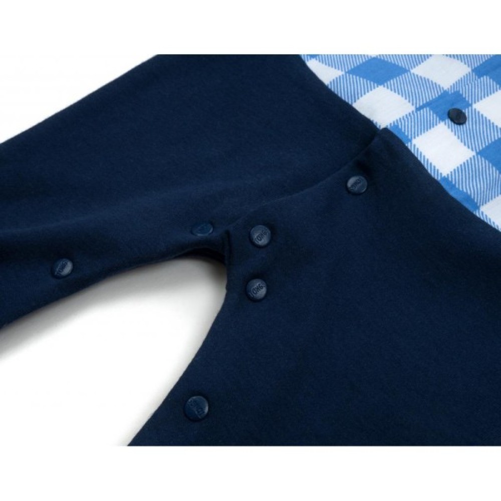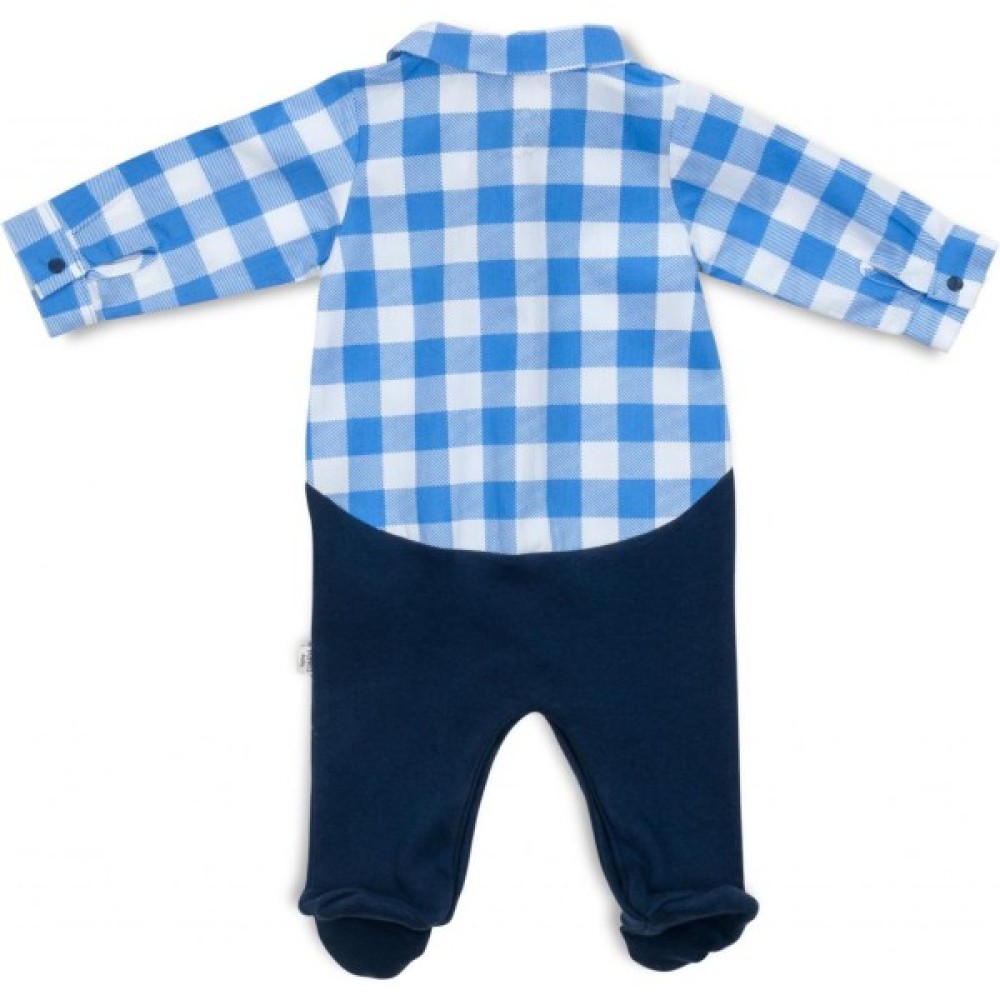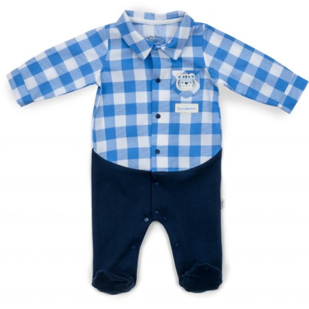 Затишна модель модного дизайну з довгими рукавами і зашитими ніжками зі слідочками. Легко та швидко знімається і одягається завдяки застібці на кнопочки по всій довжині. Застібка починається від центру горловини і розходиться до ніжок, що дуже зручно і мамі, і малюкові для швидкої зміни підгузка. Верхня частина виконана з бавовняної тканини у вигляді сорочки з відкладним коміром і невеликою нагрудною накладною кишенею. Кишеня прикрашена пришитою аплікацією тигреняти. Нижня частина - приємний на дотик, м'який турецький бавовняний трикотаж.