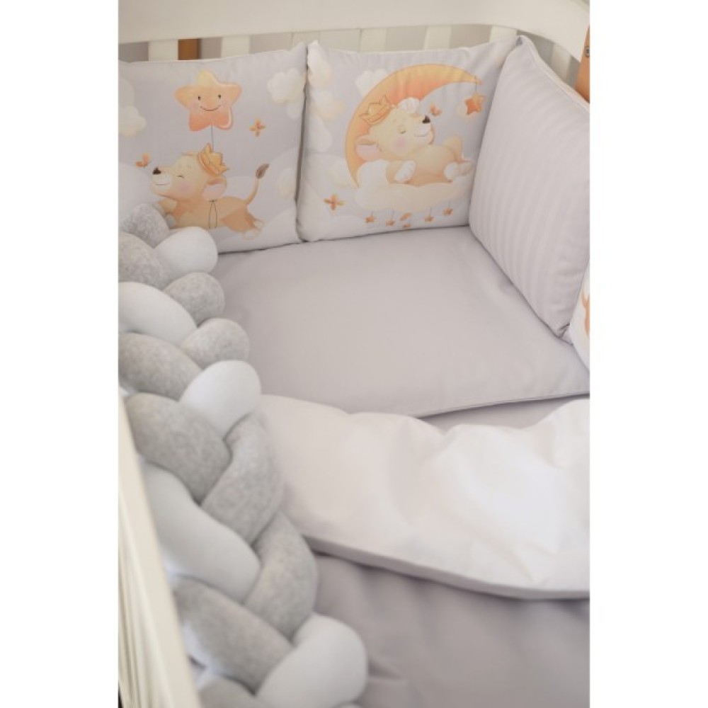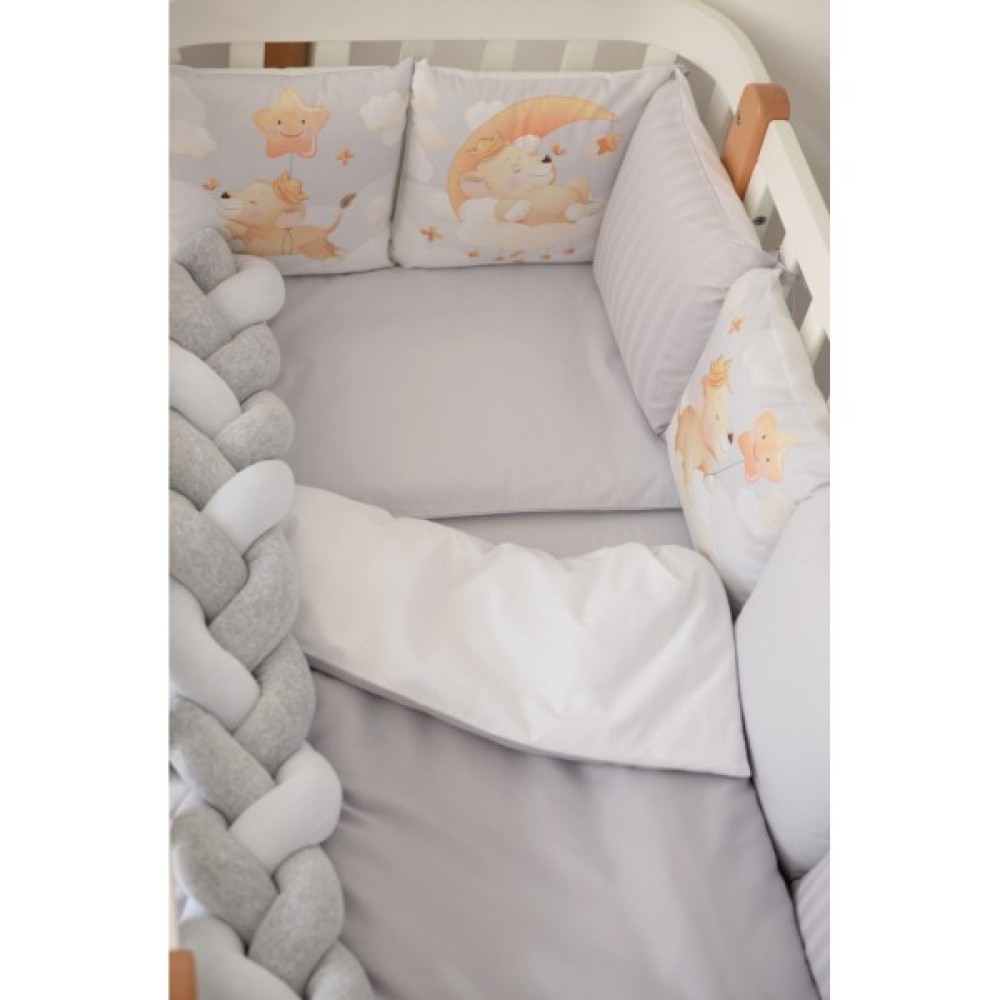 наповнювач: ковдра - силіконізоване волокно, подушка, подушки захисту - синтепон, бампер-коса - холлофайбер