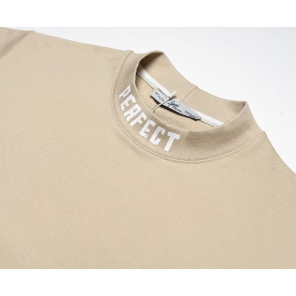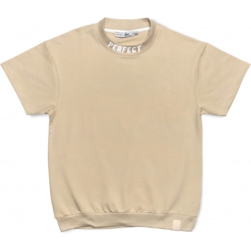 Ефектна трикотажна вільна футболка прямого силуету, під гумку, з короткими вшивними рукавами, прикрашена стильним контрастним принтовим написом «PERFECT» на горловині – відмінне елегантне доповнення до гардеробу вашого модника.