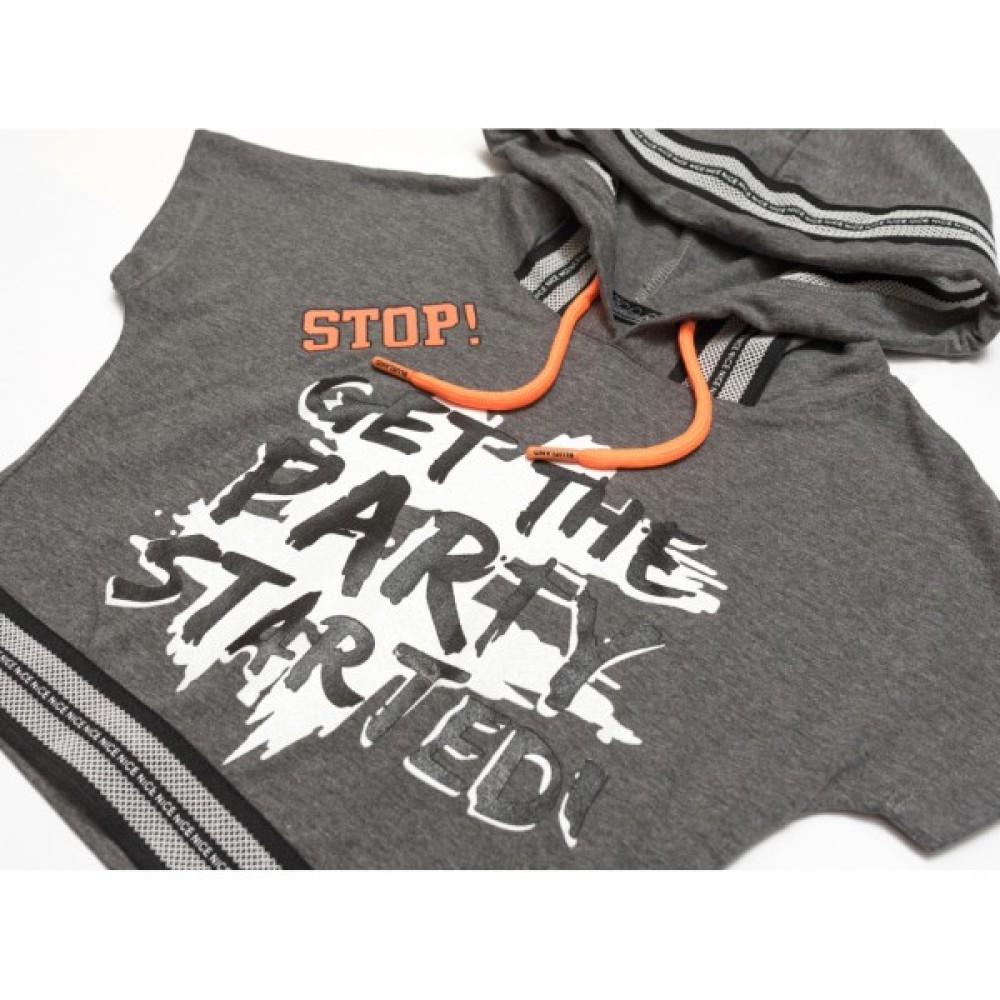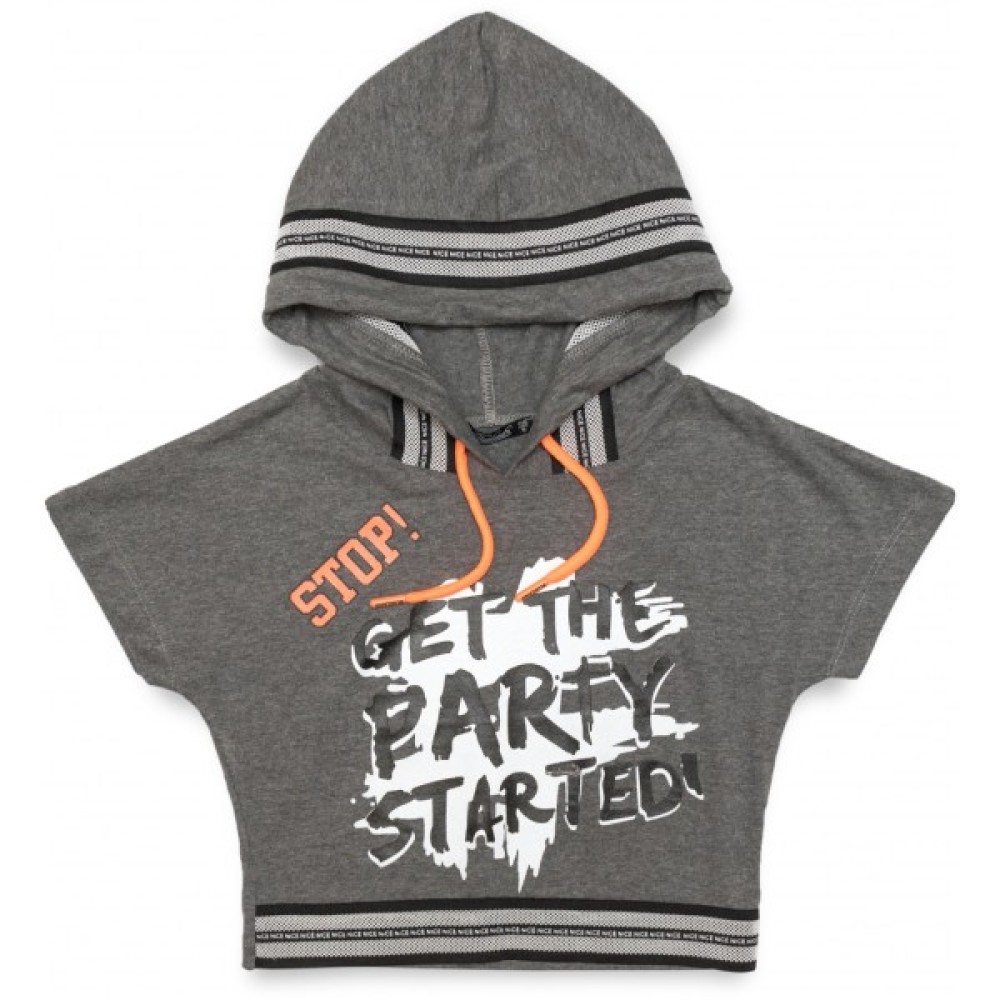Укорочена широка футболка з капюшоном і коротким суцільнокроєним рукавом, спереду прикрашена стильним об'ємним принтовим малюнком. Внизу перед призібраний на класну гумку-сітку середньої ширини, яка пущена вставкою вздовж краю капюшона. Капюшон вшитий, з вставленим у куліску, функціонуючим яскравим шнурком.