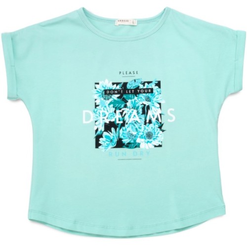 • Чудова футболка приємного м'ятного кольору, прикрашена на грудях ефектним принтовим квітковим малюнком і написом «PLEASE DON`T LET YOUR DREAMS RUN DRY».