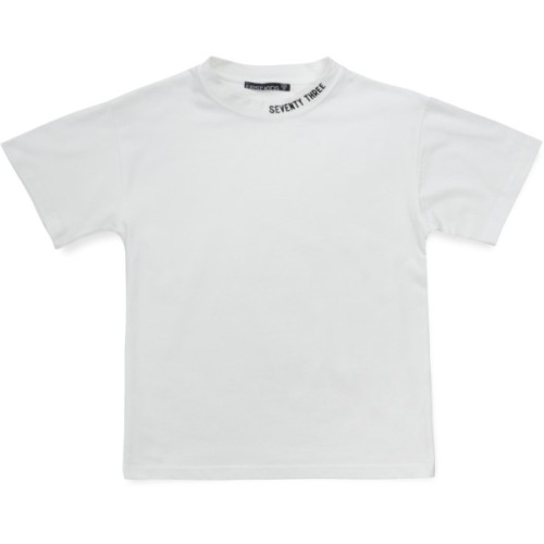 - Горловина еластична кругла, не глибока (під шию), оформлена трикотажною обтачкою з основного трикотажу та прикрашена ефектним чорним принтовим написом.