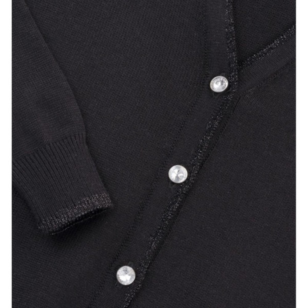 Однотонна, тонка в'язана лицьовою гладдю, трикотажна кофта чорного кольору з довгим рукавом - один з предметів базового гардероба, який можна носити практично з усіма речами. Зліва на грудях невеличка вишивка. По V-подібній горловині і по застібці-планці – подвійна, а по низу кофти та рукавів – одинарна, еластична тонка резинка з додаванням блискучого чорного тонкого люрексу по краях. Застібається на красиві круглі оригінальні ґудзики, які за формою нагадують дорогоцінні сріблясті кристалики, в цій моделі не тільки функціональний, але й декоративний елемент, який розбавляє класичний образ, створений однотонною чорною кофтою, і надає їй оригінальності та привабливості.