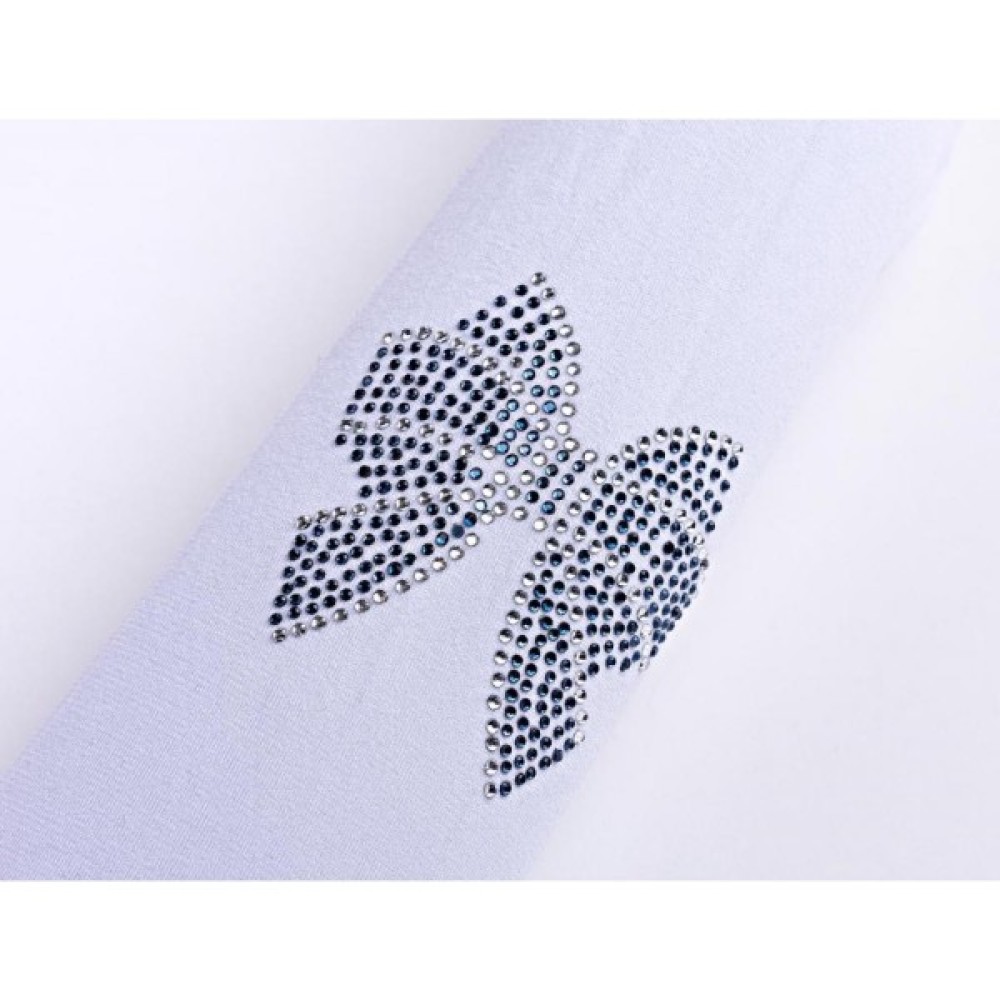 Нарядні білі капронові колготи з красивим бантиком зі сріблястих і синіх маленьких страз, розташованим знизу на зовнішній стороні ніжки. Колготи з одним середнім швом, зручною подвійною гумкою та з однаковою щільністю по всій поверхні (без ущільнень на п'ятці та на носочку). М'які та приємні на дотик, добре тягнуться і відмінно сидять на дітках, набуваючи анатомічної форми їх ніжки.