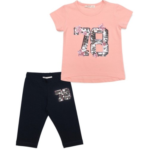 Стильний комплект–двійка з тонкого турецького трикотажу для вашої модниці у стилі «спортивний шик»: ніжно-персикова футболка та темно-сині бриджі.