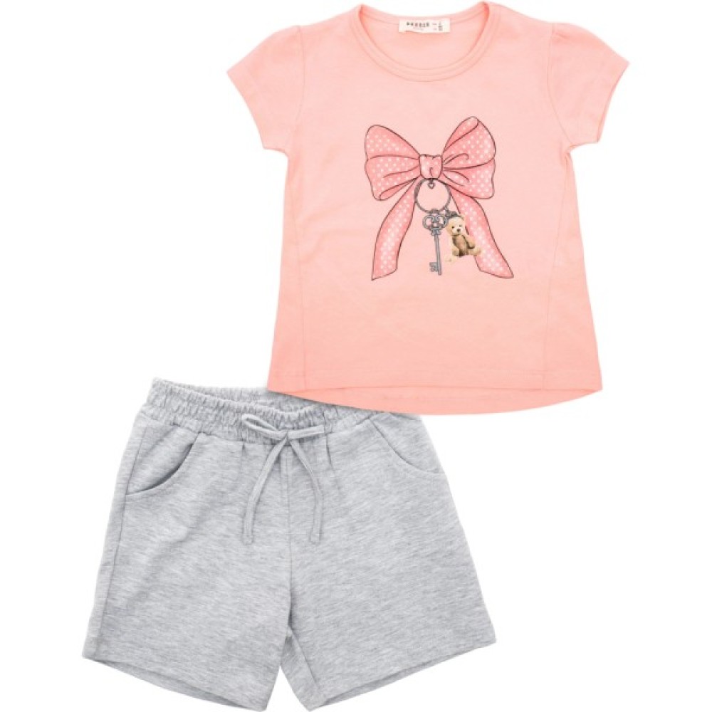 •Симпатичний трикотажний комплект для дівчинки з тонкого бавовняного (90% бавовна) турецького трикотажу, гладенького, дуже якісного та приємного на дотик: персикового кольору футболочка та сірі меланжеві шортики.