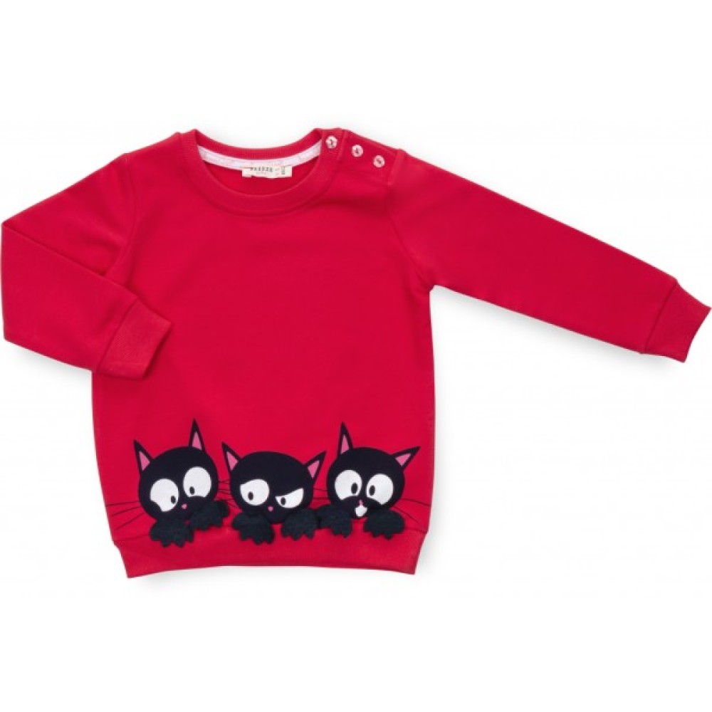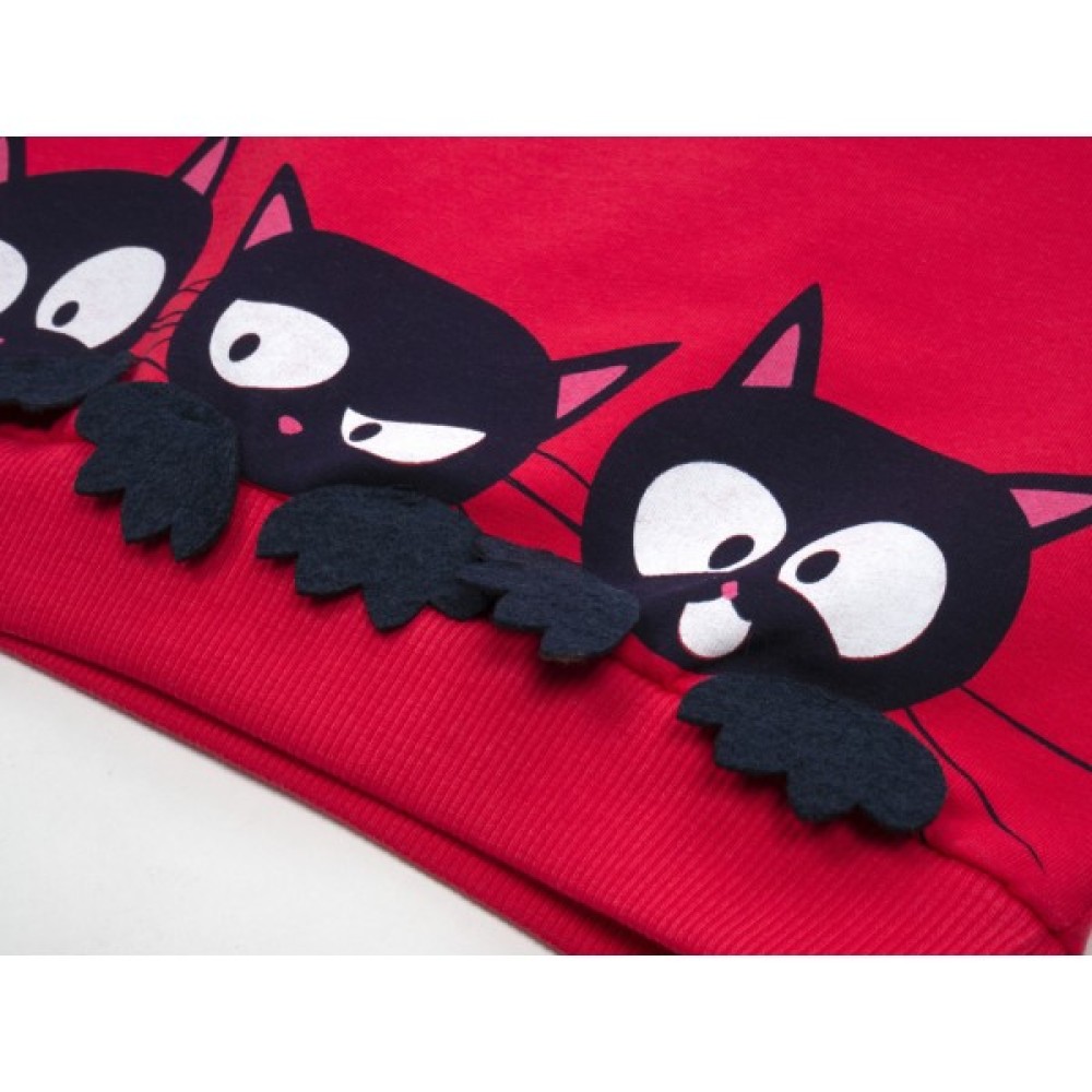 Затишний світшот приемного коралового кольору, прямого силуету, прикрашений яскравими мордочками котиків з пришивними лапками. Кругла горловина, манжети рукавів та низ світшота оброблені подвійною якісною трикотажною гумкою. У розмірах 86, 92 та 104 на світшоті у плечовому шві є застібка на гарні перламутрові ґудзички.