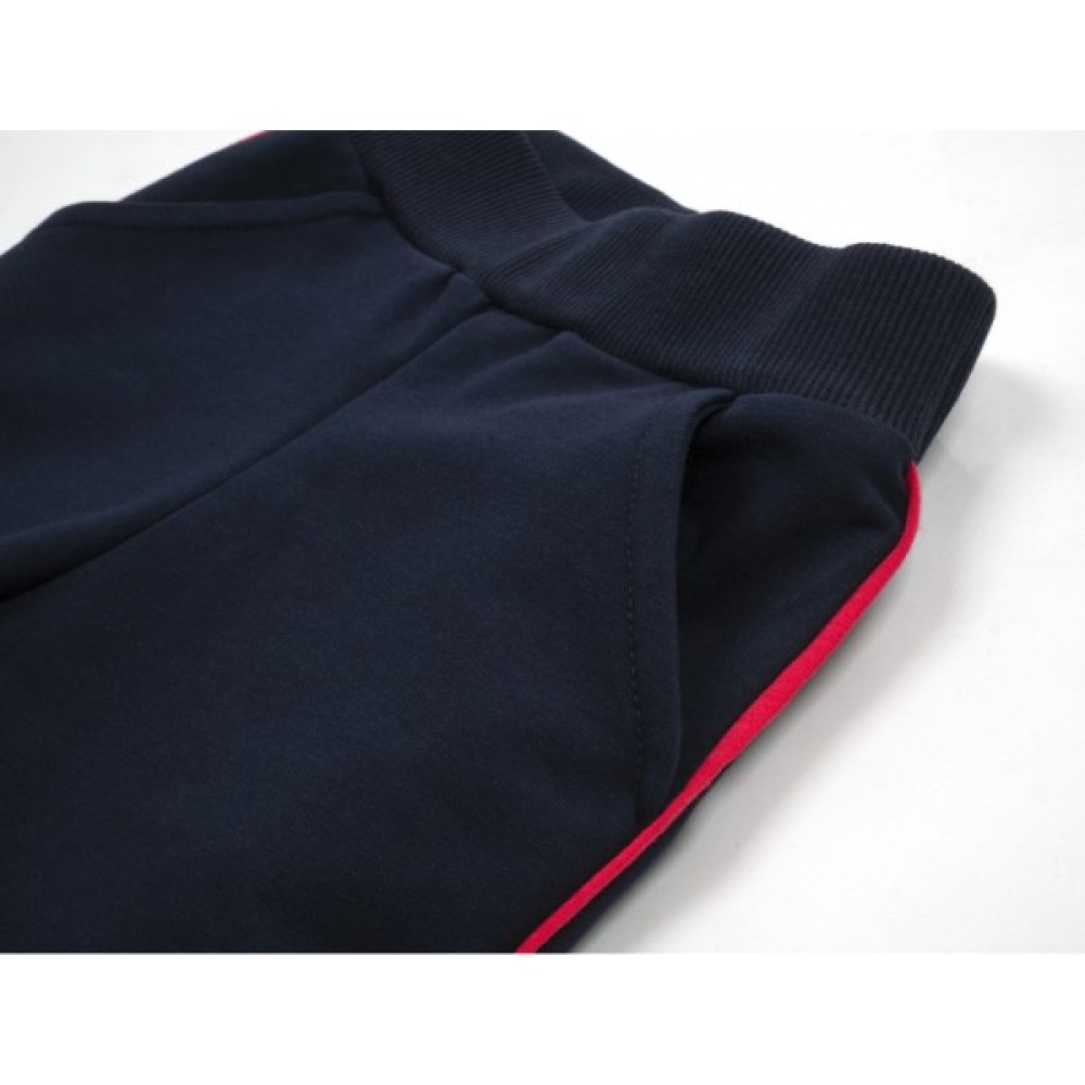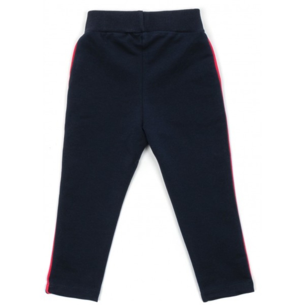 Ефектні, зручні, облягаючі лосини темно - синього кольору, з еластичним поясом з подвійної трикотажної гумки, забезпечать оптимальну посадку по фігурі. В поясі додатково вставлена всередину широка гумка. Лосини прикрашені з боків лампасами в тон світшота.