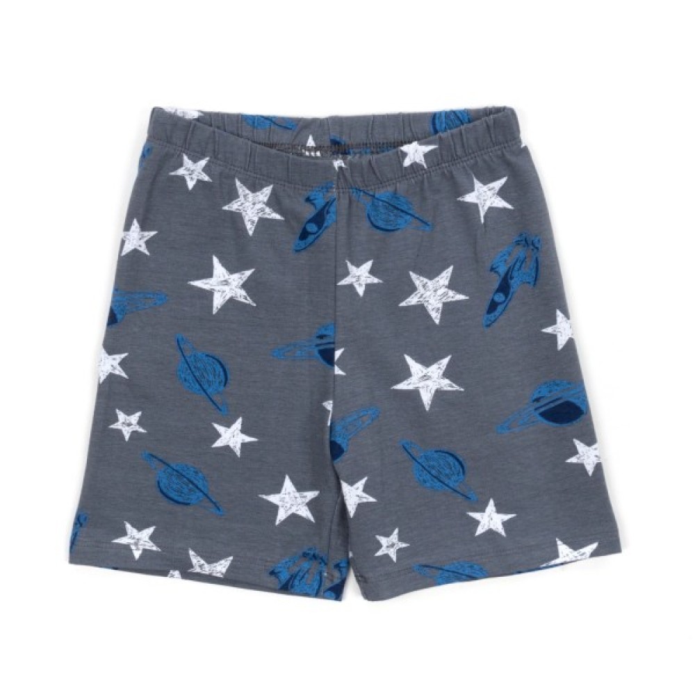 Вільні шорти темно - сірого кольору, під гумку в поясі, забезпечать затишок, комфорт та оптимальну посадку по фігурі. Прикрашені зірочками, літаками, небесними тілами.