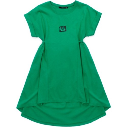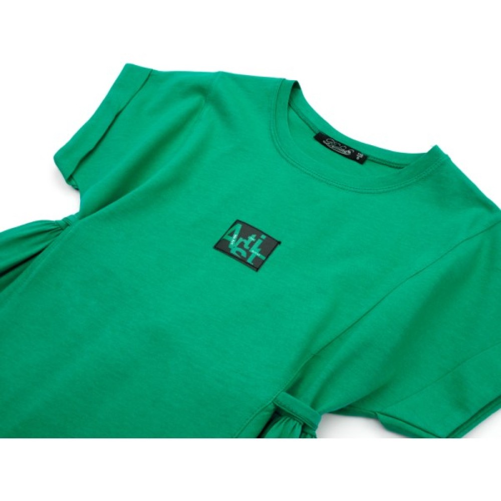 Верх сукні з суцільнокроєним коротким рукавом та трохи поглибленим вирізом горловини. Лінія горловини оброблена еластичною трикотажною бейкою. Краї рукавів із маленькими модними підворотами. Спереду поличка прикрашена принтованной емблемою.
