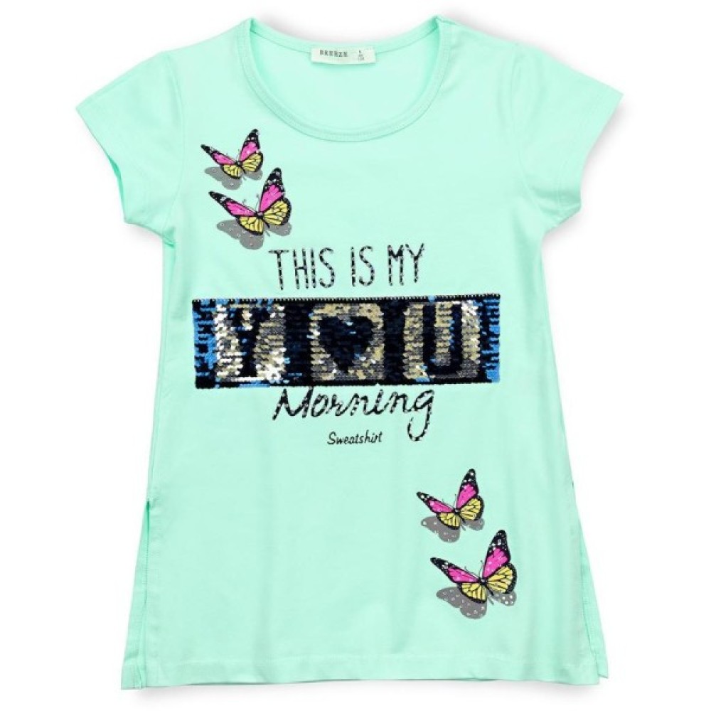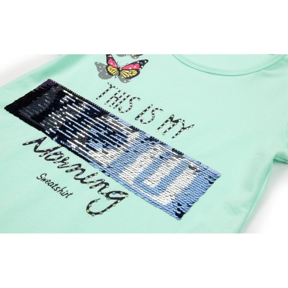 Ефектна туніка А-силуету приємного м’ятного кольору. Красиво прикрашена класною аплікацією, зі сріблясто-синіх паєток, які перевертаючись міняють колір, контрастними написами та яскравими метеликами, декорованими переливчастими стразами «Сваровськи». Овальна горловина, окантована трикотажною бейкою. Низ туніки рівний з двома розрізами в бічних швах.