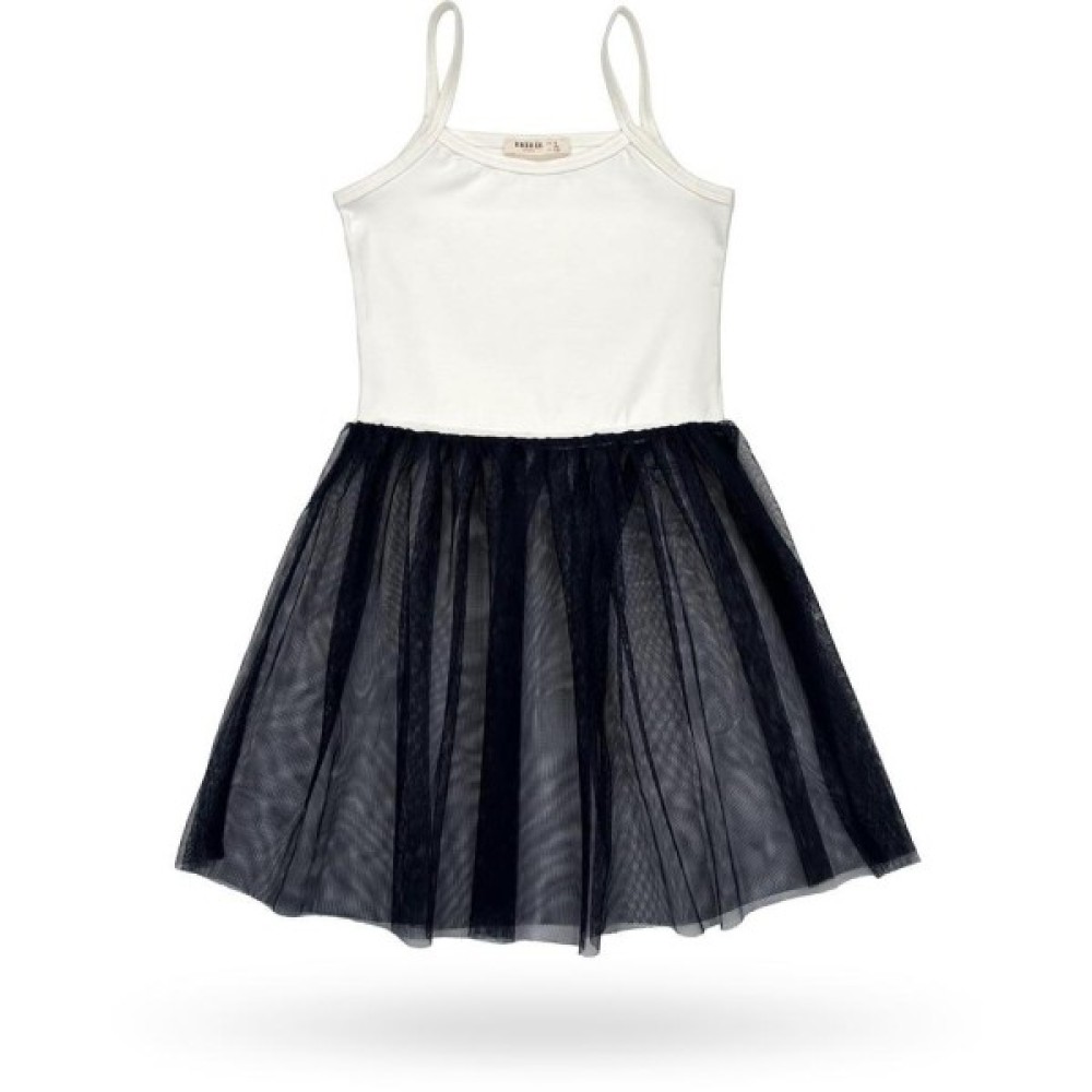Модна, трендова майка-туніка з шифоном – мрія кожної дівчинки! Укорочена верхня частина, молочно-білого кольору, з натурального бавовняного трикотажу, на трикотажних бретелях і м'який призібраний темно-синій фатин в нижній частині виглядають дуже красиво і ефектно. Лінія з’єднання еластична, на силіконовій тонкій резиночці, яка забезпечить ідеальну посадку по фігурі, підтримає форму і полегшить процес одягання.