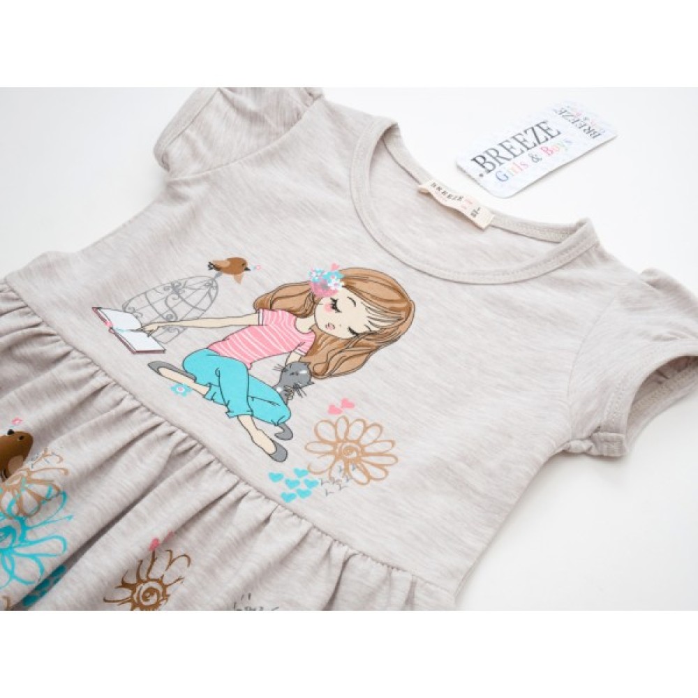 - Мила трикотажна сукня з короткими рукавами-ліхтарик, прикрашена спереду барвистим симпатичним принтовим малюнком - відмінний повсякденний варіант для вашої донечки.