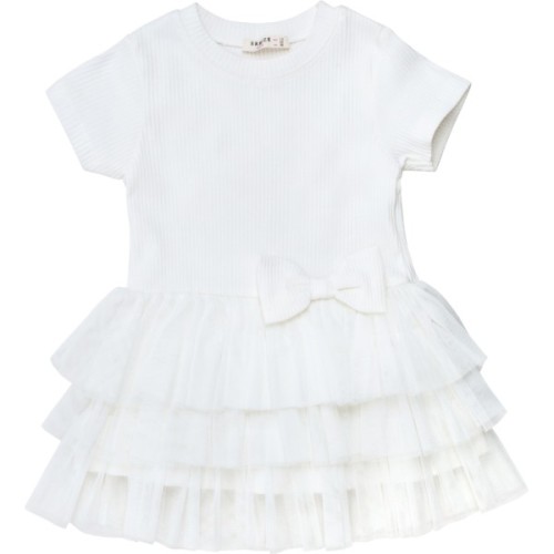 - Симпатична та дуже мила сукня молочно-білого кольору, з трохи заниженою лінією талії та ярусною фатиновою спідничкою для вашої улюбленої модниці!