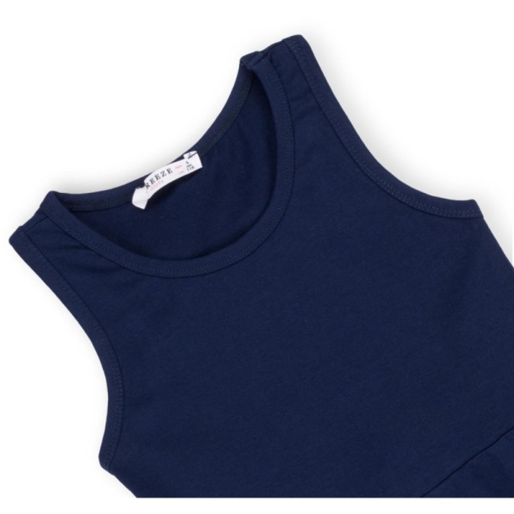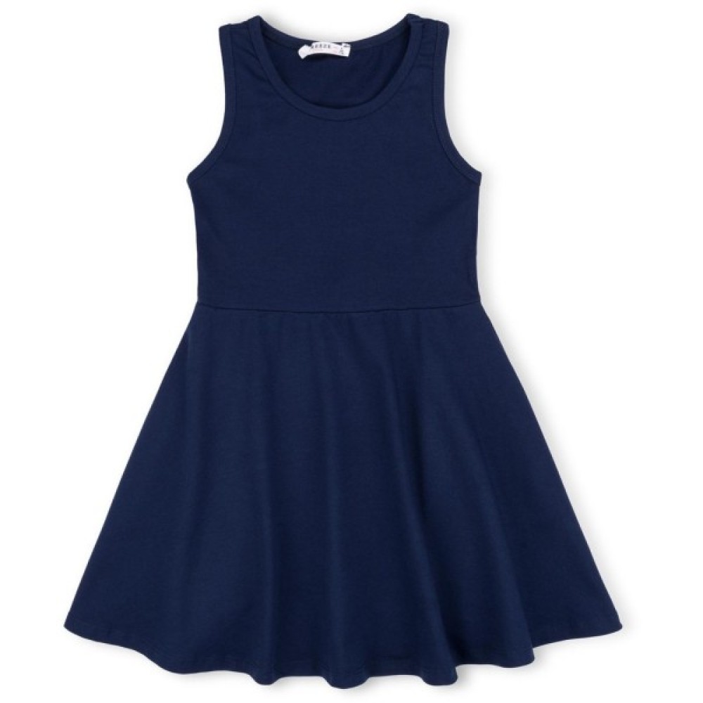 Сукня красивого темно-синього кольору, без рукавів, відрізна по лінії талії. Верх маєчного типу, спинка-борцовка - не дуже вузька, в районі лопаток ширина 15 см. Пройми і горловина оброблені еластичною бейкою з такого ж трикотажу. Трикотаж середньої щільності, не просвічується. Спідниця плаття – чверть сонця, спадає красивими фалдами.