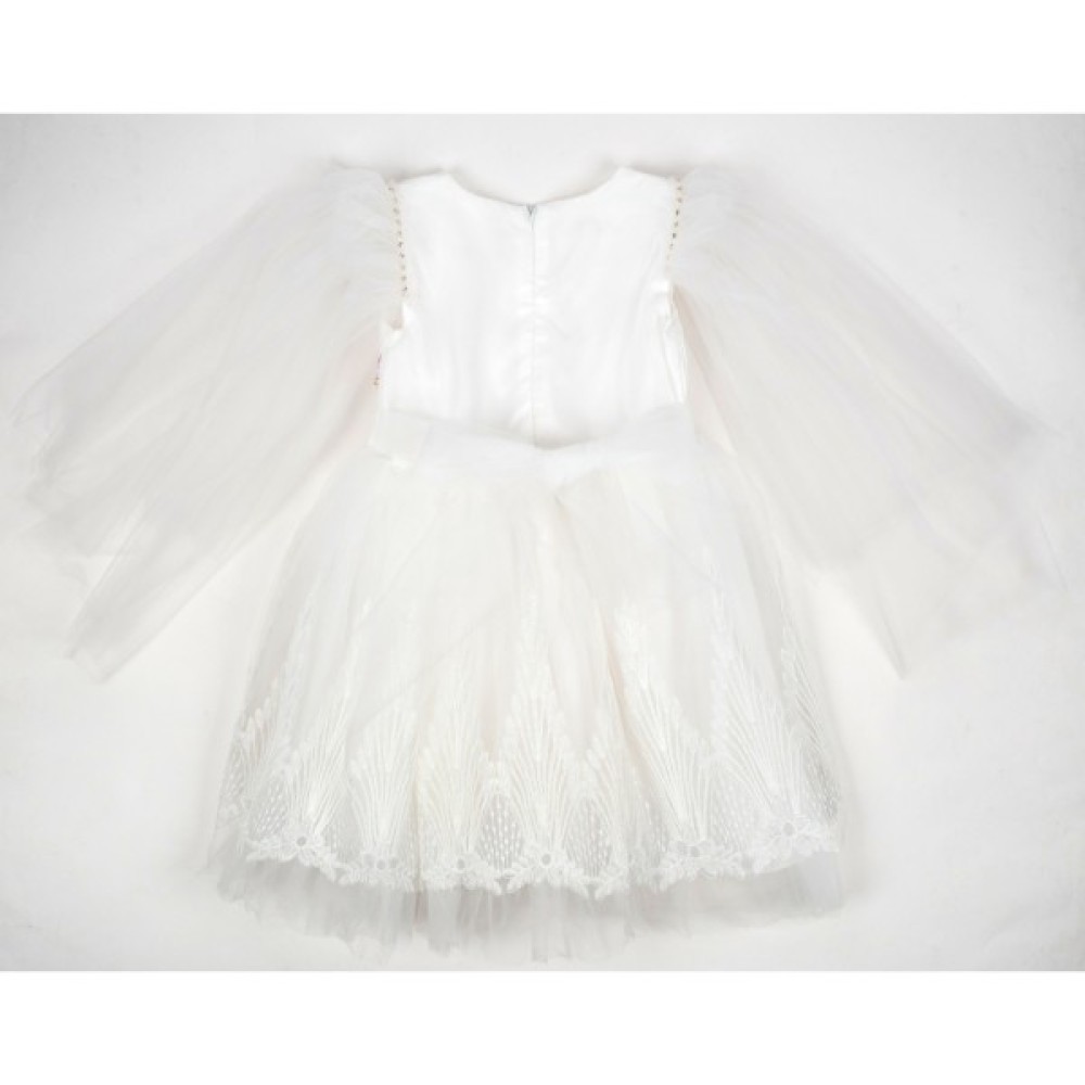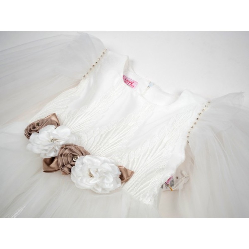 • Сукня оздоблена ефектним, красивим квітковим, знімним декором та поясом із смуги фатину, яку можна зав'язати ззаду на гарний пишний бант.