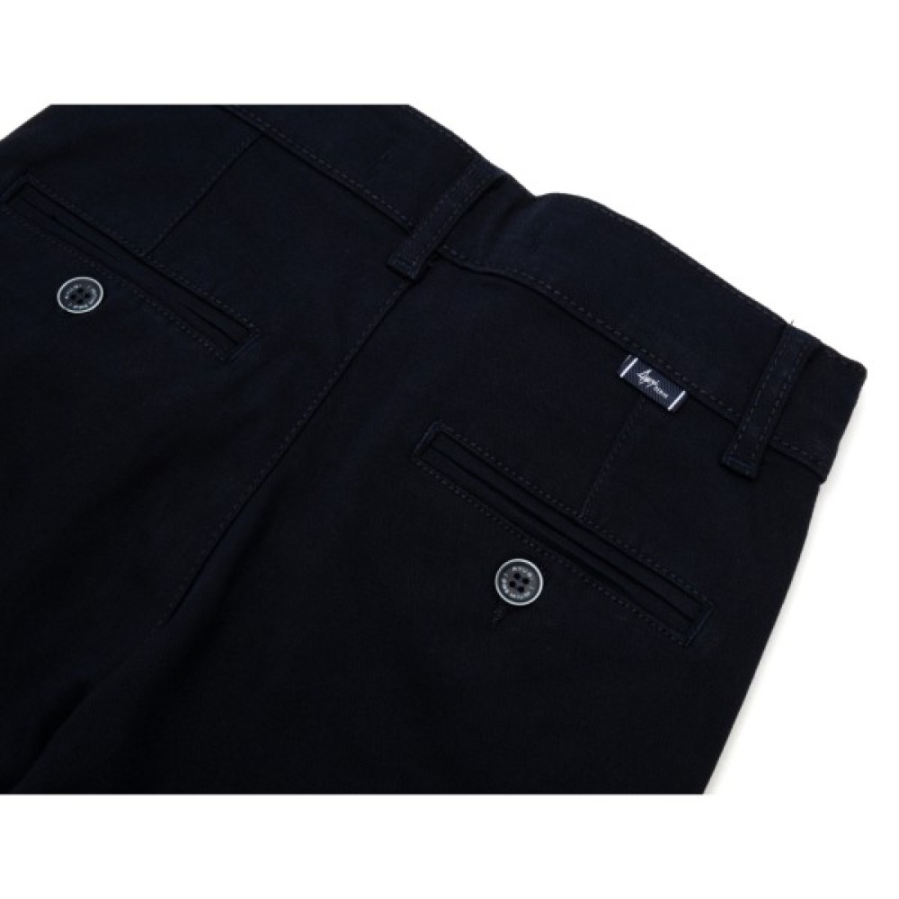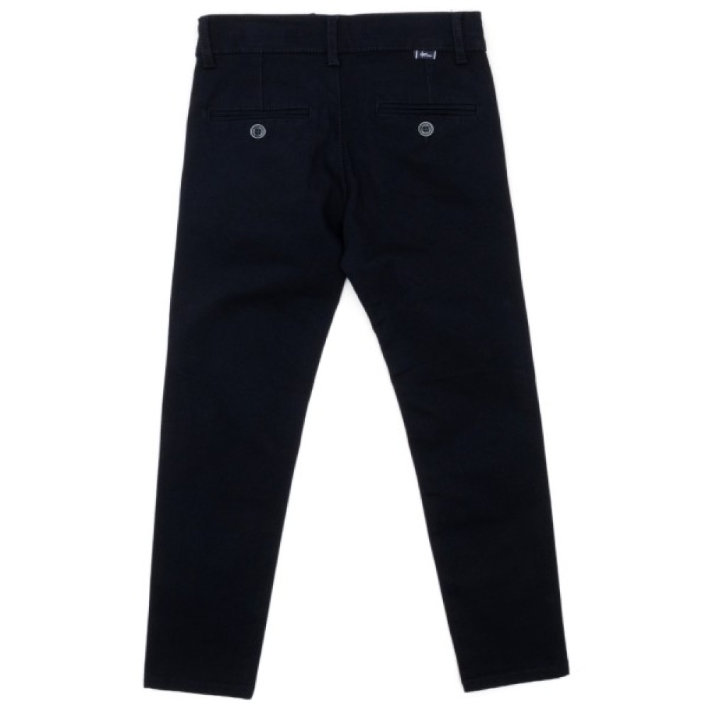 • Штани виготовлені з якісного, щільного стрейчевого котону темно-синього кольору, без утеплення, злегка завужені до низу.