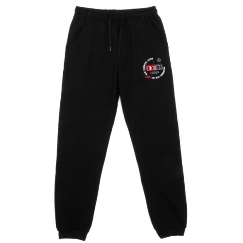 • Зручні, стильні гладко-чорні спортивні штани на манжетах по низу та під гумку в поясі, зі зручною посадкою, прикрашені спереду стильним кольоровим принтовим малюнком.