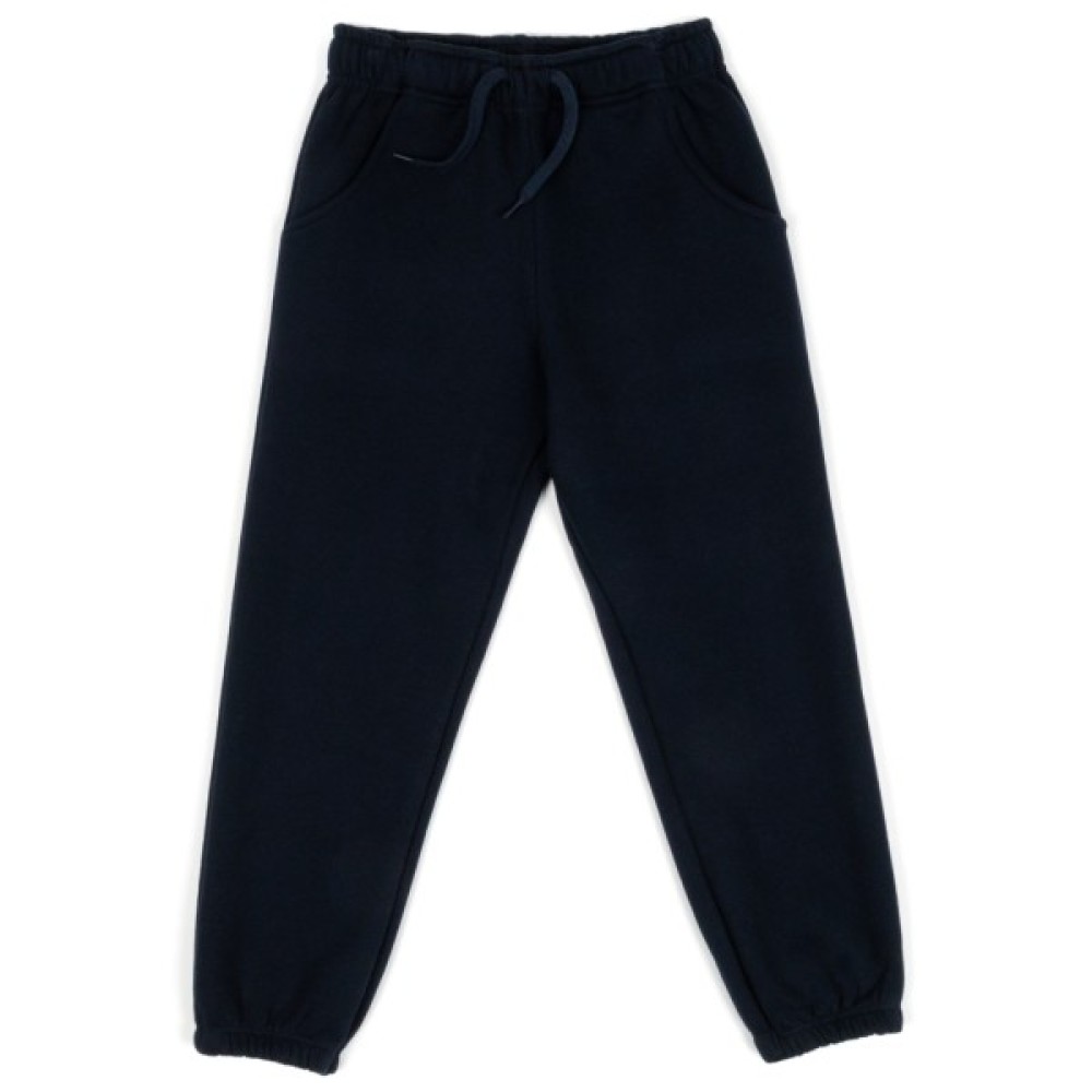 - Зручні, вільні однотонні спортивні штани для хлопчика, утеплені флісовим начосом, під гумку в поясі та по низу, без зайвих прикрас.