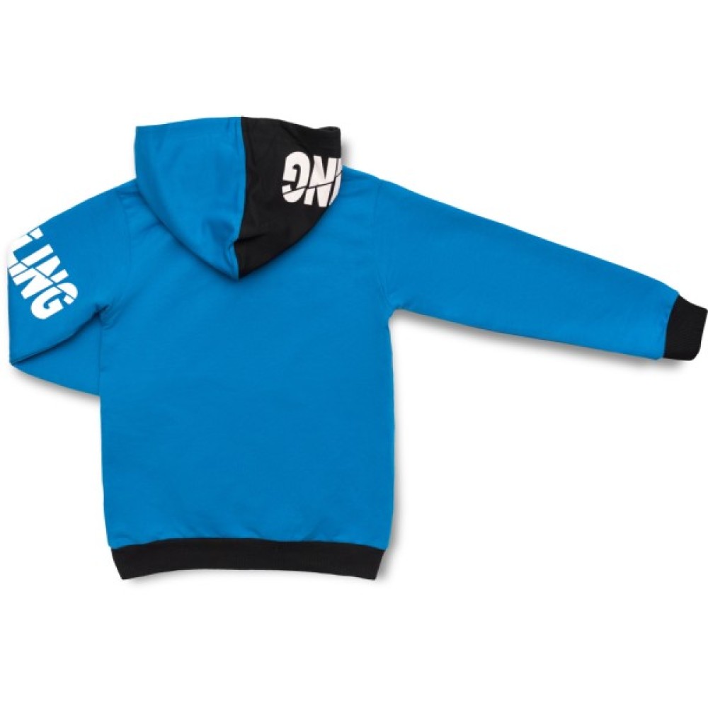 Затишний світшот з капюшоном, прямого силуету, без застібки, з довгими рукавами, виконаний у насиченому яскраво - синьому кольорі. Капюшон подвійний, має внутрішнє оздоблення чорного кольору. Прикрашений спереду об'ємним стильним принтом з елементами аплікації. Манжети рукавів і низ світшота оброблені подвійною якісною трикотажною «гумкою». Світшот доповнений врізними кишенями з контрастним оздобленням.