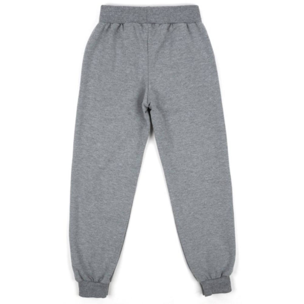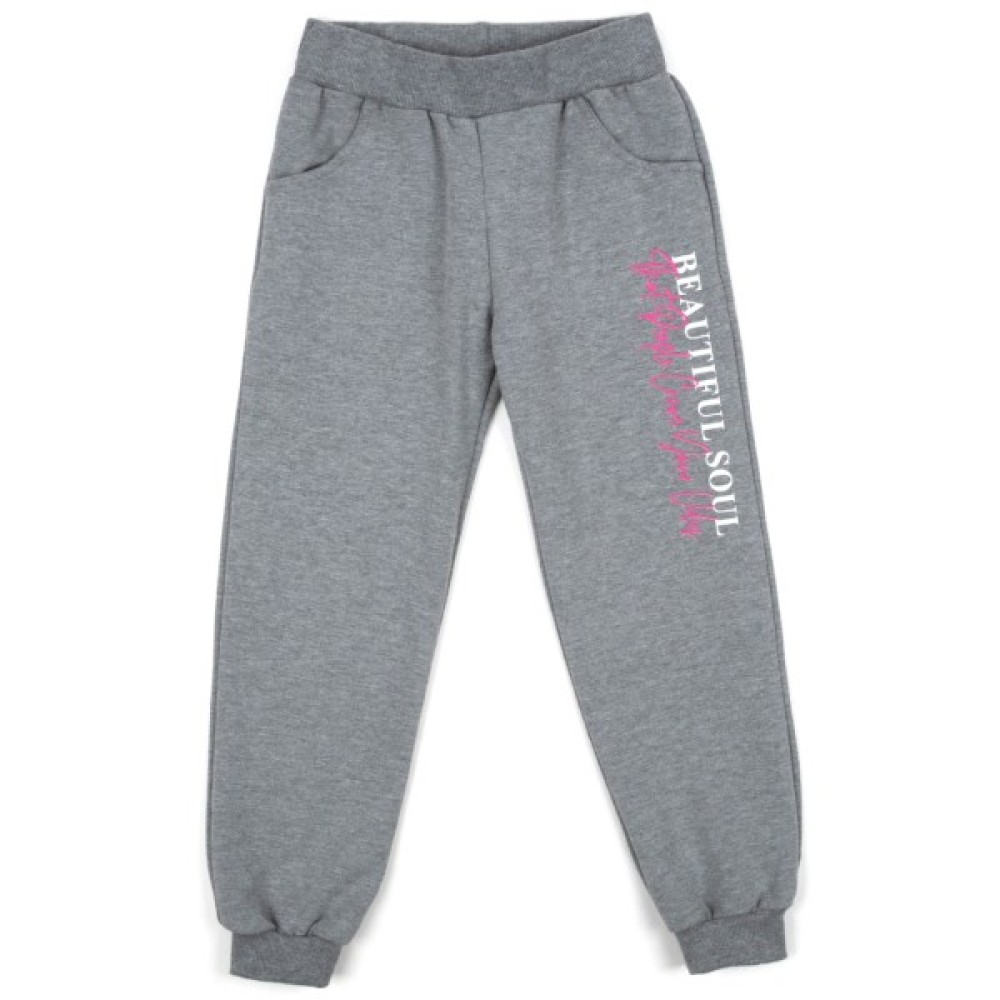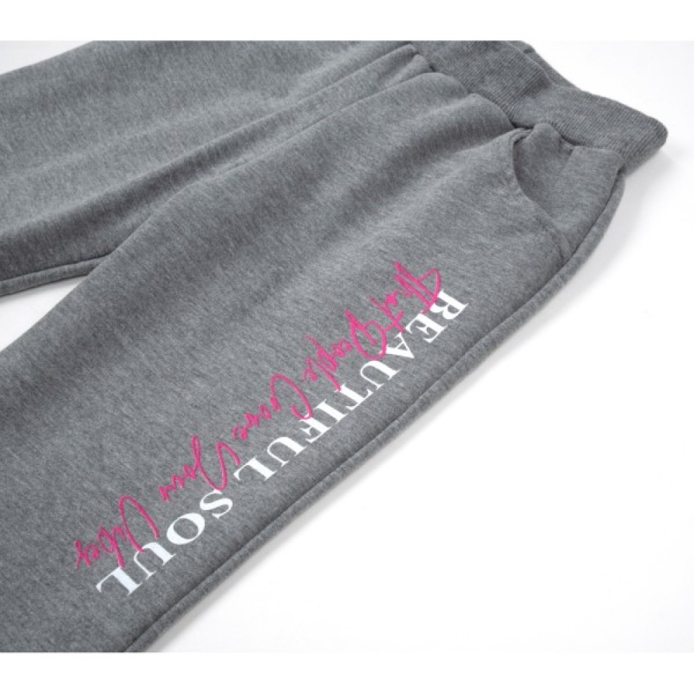- Затишний трикотажний меланжевий спортивний костюм з ефектним принтовим написом та чарівними паєтками для дівчинки: вільний світшот і штани на манжетах.