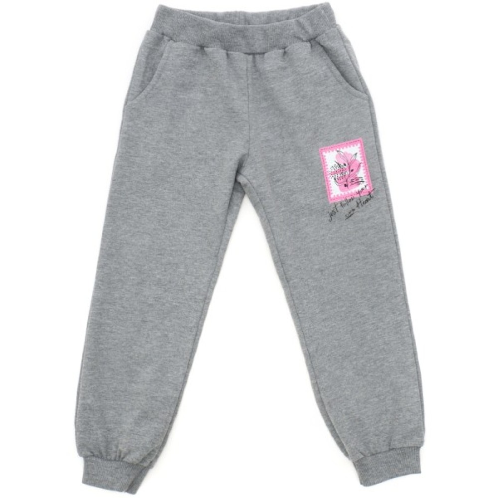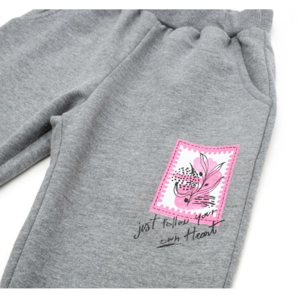 - Затишний трикотажний меланжевий спортивний костюм з симпатичним принтовим малюнком для дівчинки: вільний світшот і штани на манжетах.