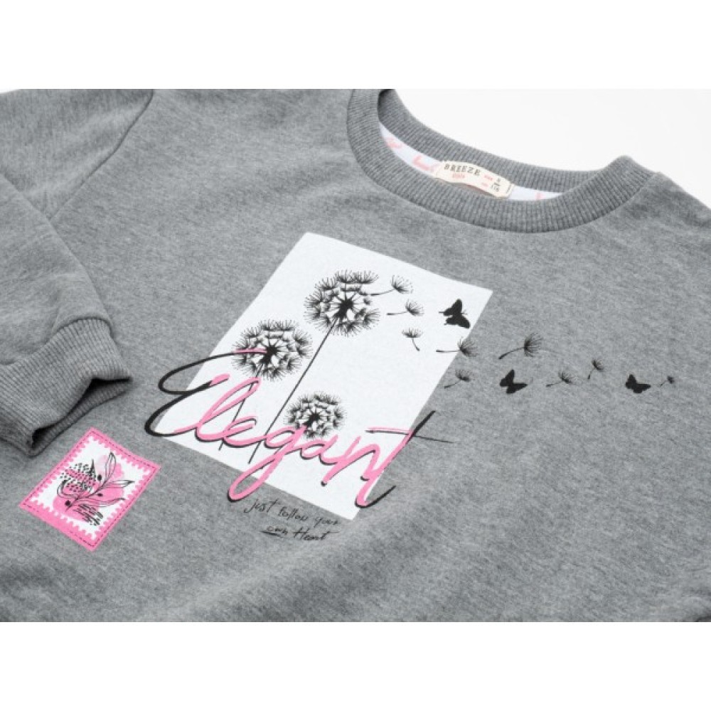 - Затишний трикотажний меланжевий спортивний костюм з симпатичним принтовим малюнком для дівчинки: вільний світшот і штани на манжетах.
