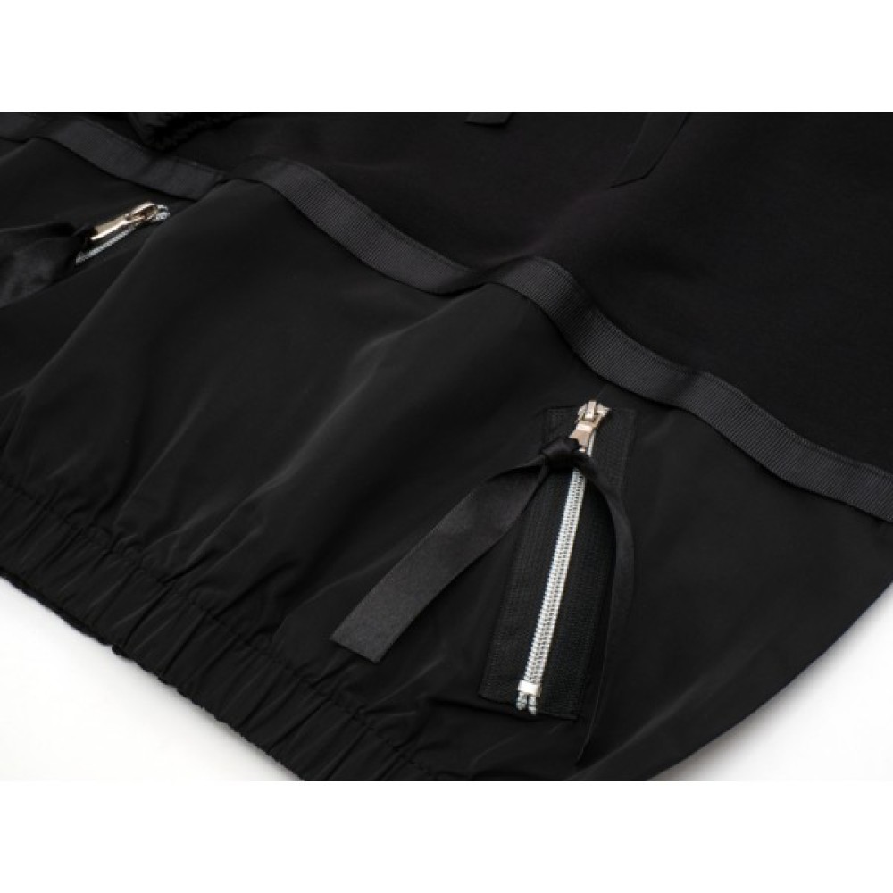• Прикрашений настроченою саржевою тасьмою та пришитими сріблястими капроновими блискавками (не кишені!) з металевими бігунками + на бігунки зав'язані чорні атласні стрічки.