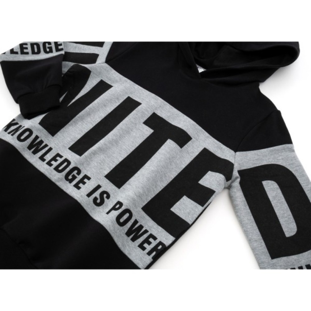 - Худі чорного кольору, напіввільного прямого покрою, з довгими вшивними рукавами та каптуром, прикрашений на вставках з контрастного трикотажу об'ємними, стильними принтовими літерами та написами. Манжети на рукавах та лінія низу - якісна рібана (подвійна, м'якенька та щільна трикотажна