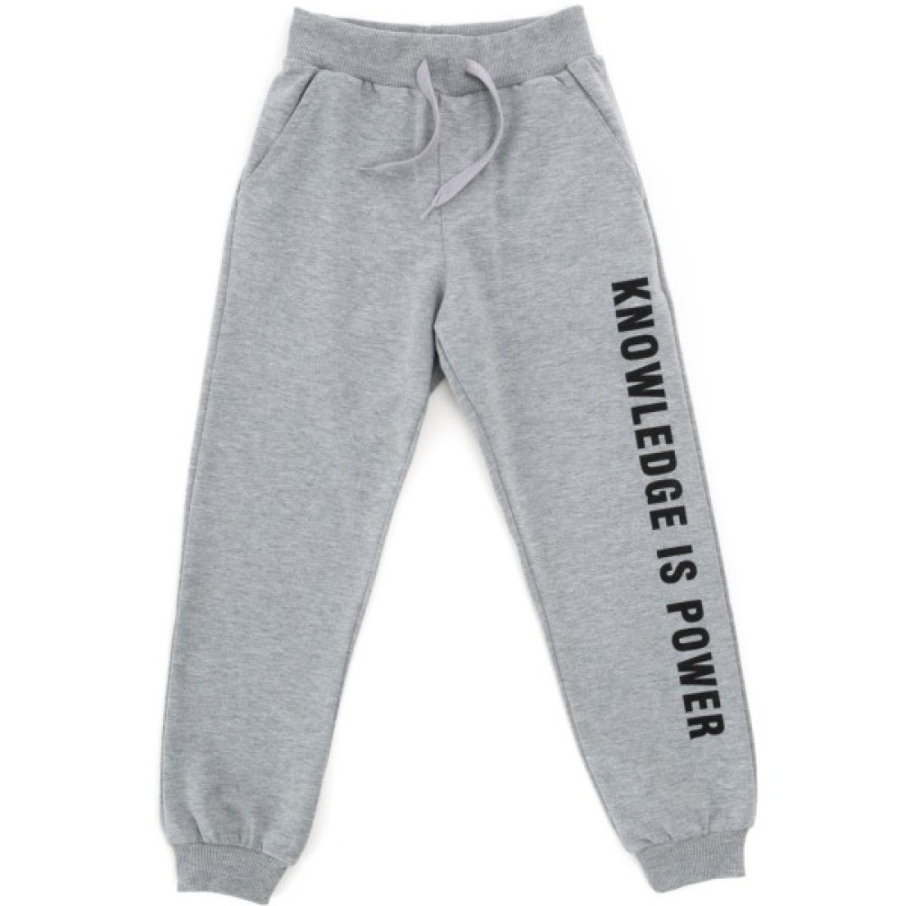 • Штани світло-сірого кольору, на манжетах, з двома передніми прорізними кишенями, без застібок. Еластичний широкий пояс і манжети - рібана (в подвійну трикотажну «гумку»), забезпечать комфорт і оптимальну посадку по фігурі. Пояс додатково посилений широкою вставленою «гумкою». Шнурок - декоративний. Штани прикрашені якісним, контрастним принтовим накатом чорного кольору.