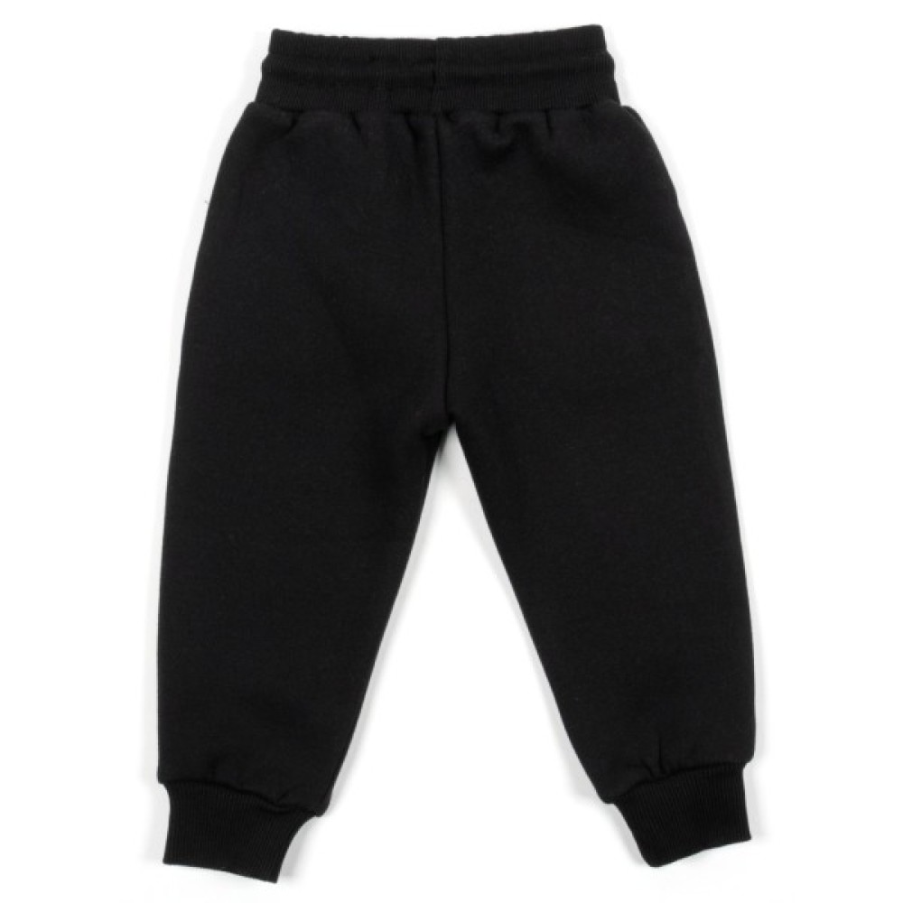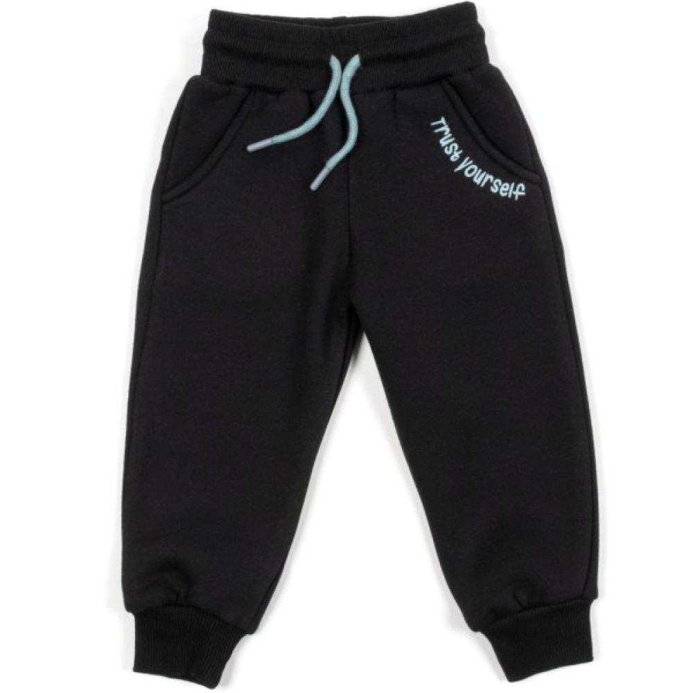 • Зручні, гладко-чорні, не широкі штани на манжетах, з двома прорізними кишенями та еластичним широким трикотажним поясом з подвійної трикотажної «гумки», забезпечать комфорт при носінні та оптимальну посадку по фігурі. Штани прикрашені біля входу в кишеню контрастною акуратною вишивкою. В поясі є круглий, функціонуючий шнурок з пластиковими накінечниками.