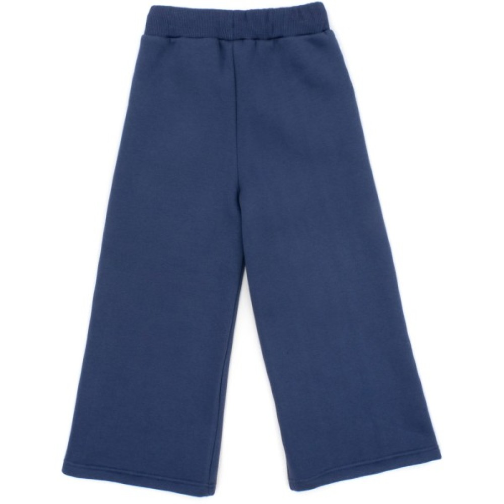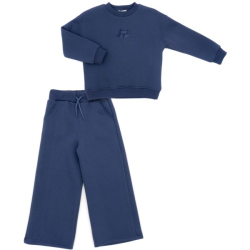 - Модний, ефектний трикотажний костюм на флісі для дівчинки виконаний в кольорі індиго: вільний світшот і прямі широкі штани-палаццо.