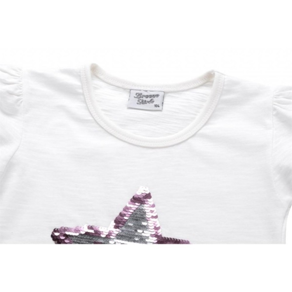 Модна, стильна, приємна на дотик модель з коротким рукавом, призбореним по окату, і еластичною круглою горловиною, оформленою трикотажною резинкою. Спереду прикрашена класною деталлю - аплікацією у вигляді зірки з написом «LOVE» в середині, виконаною з сріблястих і рожевих пайєток. Родзинка цієї аплікації в тому, що якщо рукою поміняти напрям пайєток, то змінюється і колір аплікації.